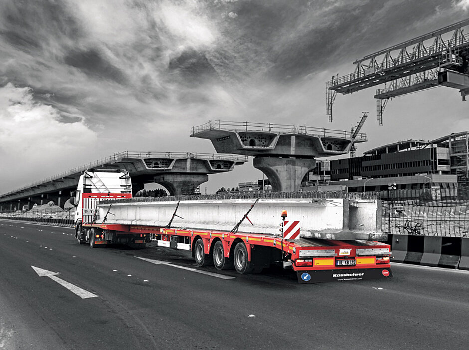 Der K.SPA M, ein Schwerlast-Plattformsattelanhänger mit drei und vier Achsen, gilt mit einem ausziehbaren und flachen Fahrgestell, variablen Container-Positionierungskombis und verschiedenen Optionen zur Ladungssicherung wie einer Code XL-zertifizierten Stirnwand, die bis zu 22,5 t Längslasten standhält, als ein typisches Beispiel für Schwerlasttechnik von Kässbohrer. Der K.SPA M ist an »Mega Trucks« anpassbar und erhöht mit seinem bis zu 6 900 mm ausziehbaren Fahrgestell und besonderen Schiebeplattformeigenschaften die betriebliche Flexibilität. Zudem lobt die Metallisierungsbeschichtung eine maximale Beständigkeit gegen Korrosion und Rostperforation aus.