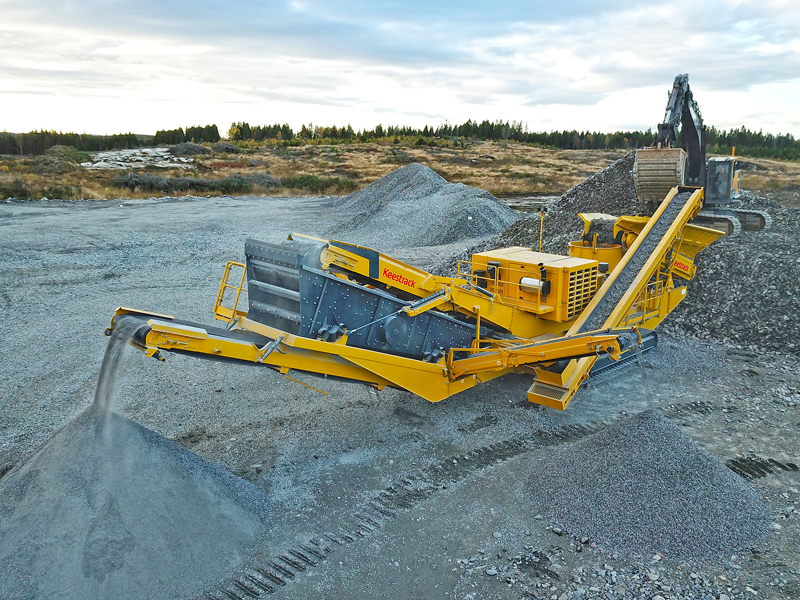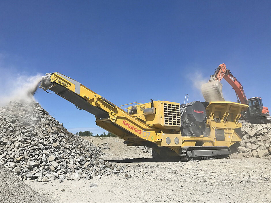 Eine hohe Produktionsleistung in der Sekundär- und Nachzerkleinerung gewährleistet der vollhybride Kegelbrecher Keestrack H6e. Bei einer max. Aufgabegröße von 215 mm, sehr variablen Brechkammer-Konfigurationen und Hubeinstellungen (C.S.S.: 6 – 44 mm) verarbeitet der auf Basis bewährter Sandvik-Technologie adaptierte Keestrack KT-H6 bis zu 400 t/h unterschiedlichster Ausgangsmaterialien. Ein leistungsfähiges Dreideck-Nachsieb (insg. 24,5 m² Siebfläche) mit Überkornrückführung liefert optional direkt verwertbare Endprodukte und garantiert so hohe Wertschöpfung im Betrieb. Die leistungsstarken E-Motoren für Brecherantrieb und Arbeitshydraulik (220 kW/2 x 30 kW) und alle übrigen direkt elektrisch betriebenen Aggregate werden über ein absetzbares Diesel/Generator-Modul (345 kW/500 kVa) oder plug-in via Netz/Stromerzeuger versorgt. Mit lediglich 62 Tonnen Gesamtgewicht in Vollausrüstung (51,5 t ohne Nachsieb) lässt sich auch der Großkegel wirtschaftlich an wechselnden Standorten einsetzen.