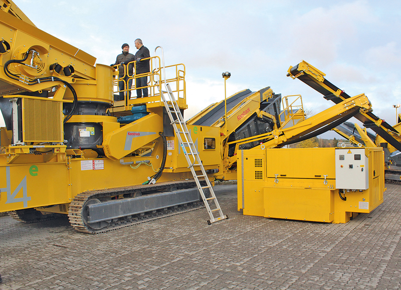 Neben zwei erfolgreichen 30-Tonnen-Brechern präsentiert Keestrack in diesem Jahr erstmals alle Flaggschiffe seiner raupenmobilen Backen-, Prall- und Kegelbrecher-Baureihen als diesel-elektrische Vollhybrid-Anlagen. Innerhalb der Klasse von 60 bis 70 Tonnen Transportgewicht sind die neuen und weiterentwickelten Modelle laut Keestrack nicht nur führend hinsichtlich Brechergröße, Ausstoßleistung, Produktqualität und -vielfalt, sondern setzen mit ihren ausgereiften Antriebskonzepten auch neue Maßstäbe im wirtschaftlichen Betrieb. Ohne Einschränkungen in Transportfähigkeit und raupenmobiler Beweglichkeit vor Ort eignen sich die diesel-elektrischen Keestrack-Großbrecher damit ebenso für das volumenintensive Baustellen-Recycling, wie für die flexible mehrstufige Produktion mineralischer Baustoffe in Gewinnungsbetrieben.
