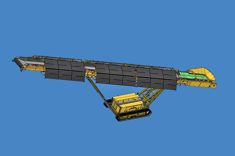 Meist nah an möglichen Stromquellen positionierte Haldenbänder mit eher geringem Leistungsbedarf eignen sich besonders gut für wirtschaftliche Alternativantriebe. Bereits frühzeitig stattete Keestrack daher seine raupenmobilen Stacker mit diesel-elektrischen Plug-In-Antrieben aus. Ganz neu werden zwei emissionsfreie Lösungen in München präsentiert. Zum einen zeigt Keestrack das leicht versetzbare elektrische Verlade-/Haldenband S1e. Installiert auf einem höhenverstellbaren Podest mit Hub- und 180°-Schwenkhydraulik, fördert das nur 5,45 t schwere und 10,20 Meter lange Band bis zu 280 t/h Sand oder Kies (max. Körnung: 200 mm) und legt stützenfrei nierenförmige Halden mit max. 2900 t Material an. Futuristisch wird es bei der Weltpremiere des raupenmobilen Haldenbandes Keestrack S5e „Solar“, der wohl ersten direkt solarbetriebenen Aufbereitungsanlage. Photovoltaik-Module über dem 23 m langen Förderband speisen eine im Chassis installierte 23-kWh-Batterie für den Betrieb aller Fahr-, Hub- und Förderfunktionen. Bei Schlechtwetter oder großem Leistungsbedarf im intensiven Dauereinsatz kann die Anlage über vorhandene externe Versorger, wie diesel-elektrische Brecher und Siebe, oder via Netzstrom angetrieben bzw. nachgeladen werden.