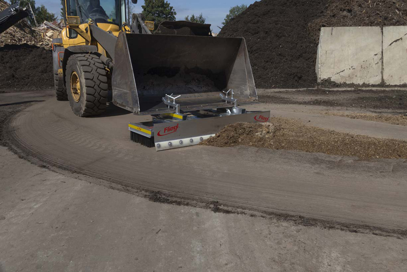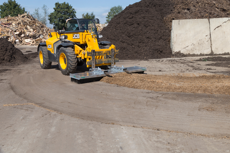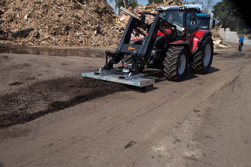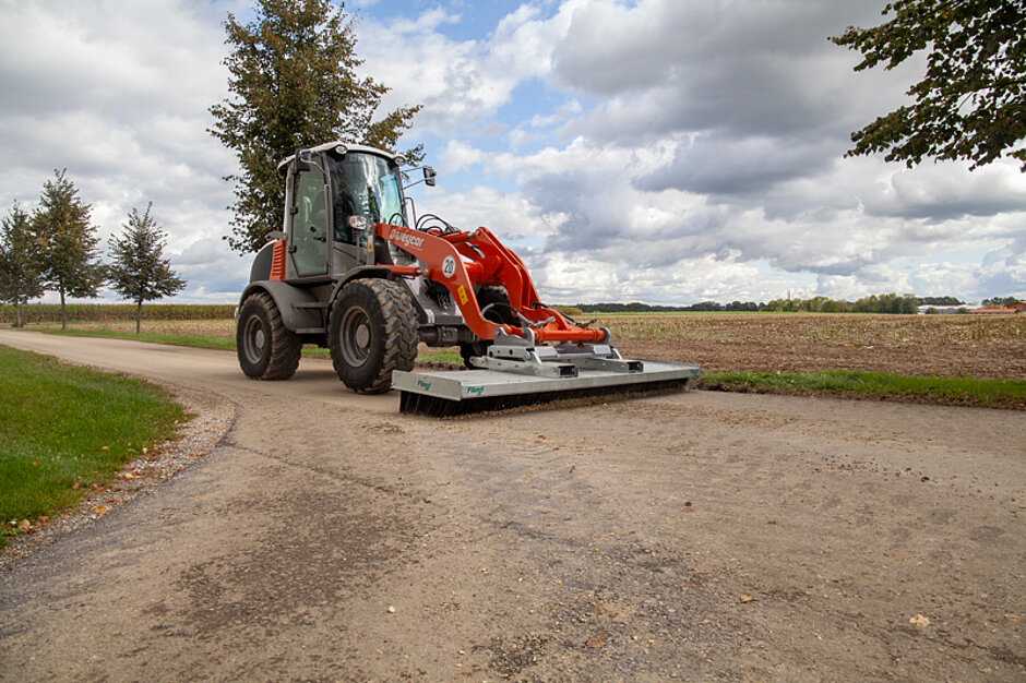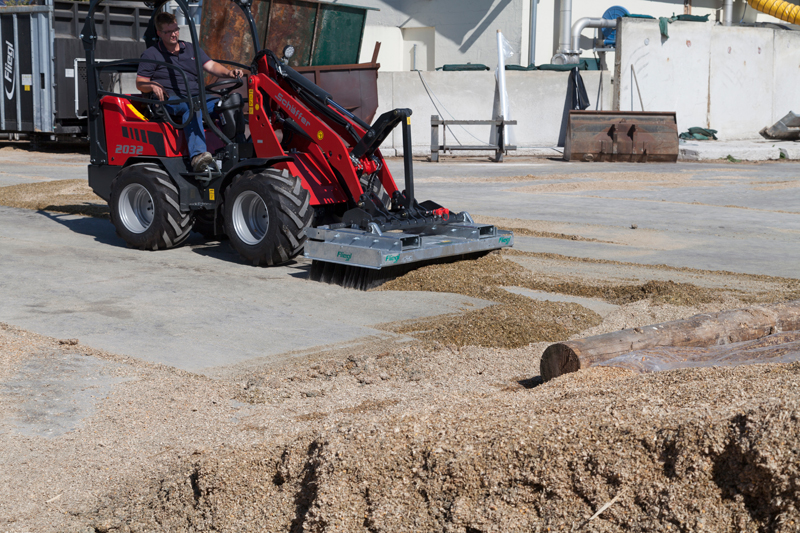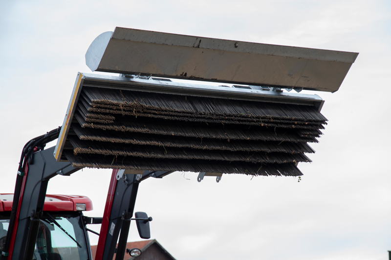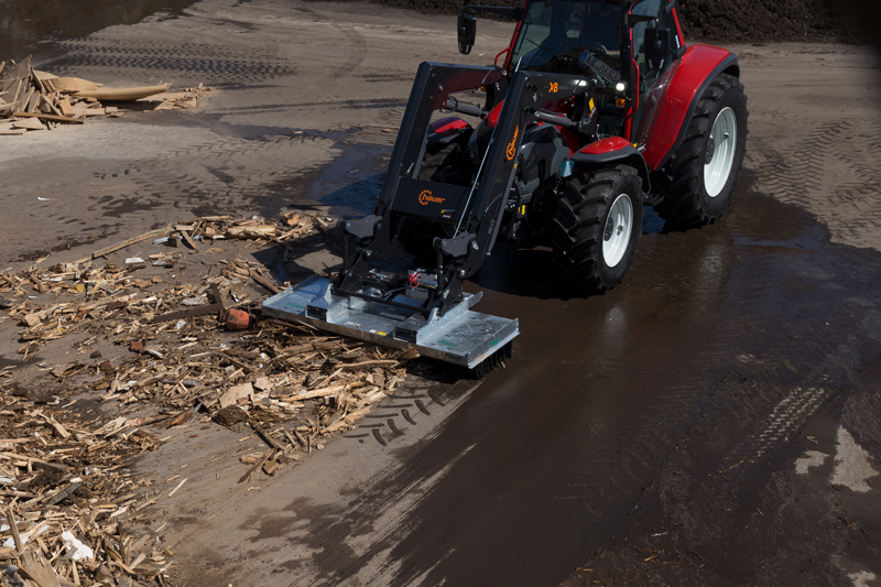 Bei Reinigungsarbeiten auf dem Hof stehen einem viele verschiedene Anbaugeräte zur Verfügung: darunter Kehrmaschinen und Kehrbesen für leichte Verschmutzung sowie größere Schiebe- und Planierschilder für starke und festgefahrene Verunreinigungen.