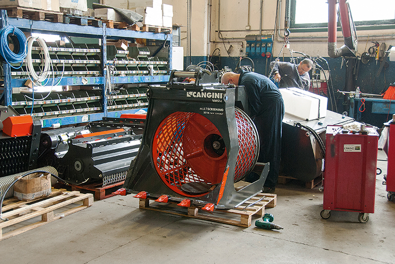Heute produziert Cangini mit 60 Mitarbeitern neben verschiedensten Baggerlöffeln und Schnellwechslern rund 60 Anbaugeräte, darunter Mulcher, Kehrmaschinen, Schneeschilde, Bohrer, Greifer, Schrottscheren, Betonmischer, Palettengabeln, Astscheren, Siebschaufeln und -löffel, ein Laser-Planierschild oder die auf der Bauma neu präsentierte Siebtrommel, bei der das stufenlose Einstellen der Siebweite aus der Kabine hydraulisch geregelt wird. Dabei kann die Weite des inneren Siebs im Bereich von 10 mm bis 60 mm eingestellt werden.