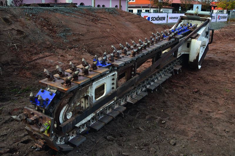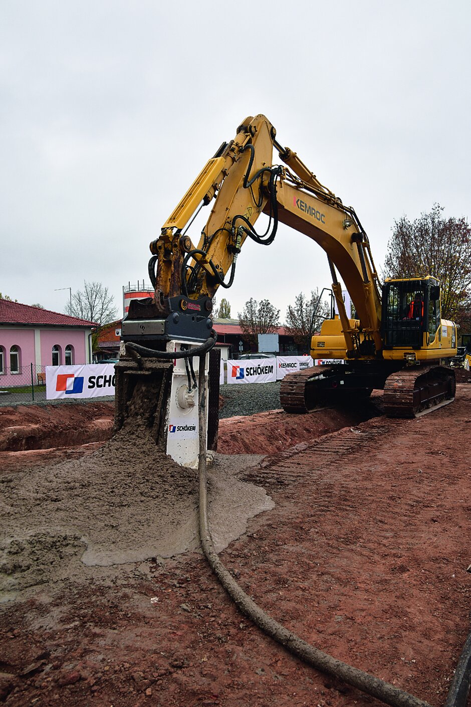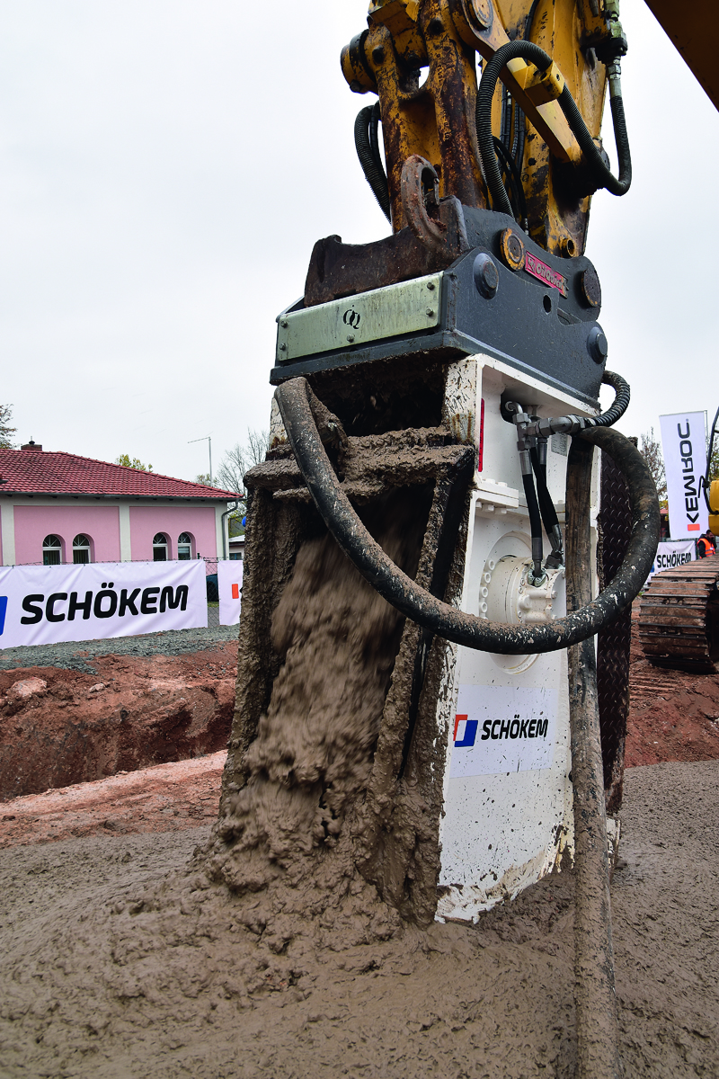 Das Schökem-Verfahren der Unternehmen Kemroc (Leimbach/Thüringen) und Schönberger Bau (Zenting/Bayern) beruht auf einer bewährten Methode zur Stabilisierung von Böden und zur Herstellung von Erdbeton. Es handelt sich um das bei Planern und Ausführenden im Spezialtiefbau seit Jahrzehnten bekannte, DIN-genormte Fräs-Misch-Injektionsverfahren zur tiefgründigen Bodenverfestigung (FMI). Bei diesem Verfahren werden Boden und Bindemittel-Suspension mit einer speziellen Bodenfräsmaschine durchmischt. Dabei entstehen homogene, wasserundurchlässige, frostsichere und fugenfreie Erdbetonkörper. In enger Zusammenarbeit haben nun der Hersteller Kemroc und das Spezialtiefbau-Unternehmen Schönberger Bau diese Vorgehensweise weiterentwickelt. Ihr neues Schökem-Verfahren ist auch den Betreibern von Standard-Hydraulikbaggern zugänglich und wird als hoch flexibel eingestuft. Durch die Modifikation von Kemroc-Grabenfräsen mit Fräskette entstand die neue Baureihe KSI (Kemroc Schönberger Injektor) mit einem Schlauchanschluss an der Antriebseinheit und seitlichen Führungskanälen zum Befördern der Bindemittel-Suspension. In modernen Suspensions-Mischanlagen (die Kooperationspartner bevorzugen eine kompakte und containermobile Konfiguration von Gertec) lässt sich der Bindemittelanteil der Suspension in der Trägerflüssigkeit genau einstellen. Durch eine Variierung je nach anstehendem Boden können Erdbetonkörper mit genau definierten Eigenschaften erstellt werden.