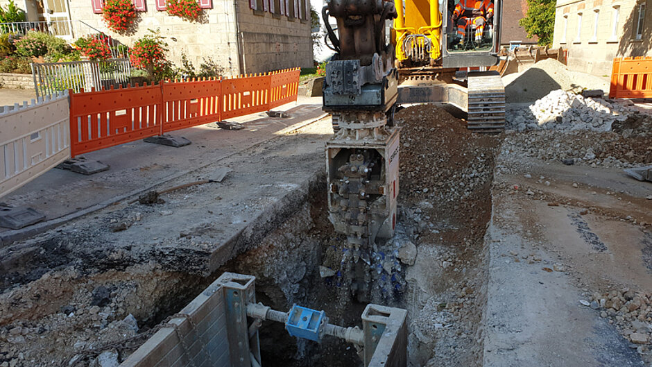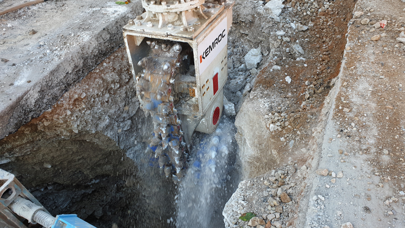 Die patentierten Kettenfräsen von KEMROC besitzen zwischen ihren beiden Schneidköpfen eine mit Fräsmeißeln besetzte, umlaufende Fräskette. Diese entfernt den beim Fräsen in festem Gestein entstehenden Mittelsteg, den herkömmliche Querschneidkopffräsen stehen lassen und der erst durch seitliches Schwenken oder durch ein anderes Bagger-Anbaugerät gelöst werden kann. Kettenfräsen dagegen formen einen Graben mit geraden Wänden, genau definierter Breite und ohne Mittelsteg. Ein mit dem Überschneiden verbundener Mehraufwand an Arbeitszeit und Energie wird vermieden, entsprechend wirtschaftlich kann der Aushub ausgeführt werden. Noch eine Tatsache kam dem Bauleiter Martin Fuchs bei seinem Projekt in Steinsfeld-Endsee gerade recht: „Das seitliche Schwenken einer herkömmlichen Querschneidkopffräse zwischen den Verbauplatten wäre schwierig und gefährlich gewesen. Insgesamt ist der Einsatz einer Kettenfräse deutlich komfortabler und schonender für Mensch und Maschine.“