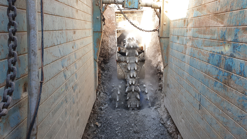 Anfang Dezember 2019 war der Grabenbau durch den mit Gips durchsetzten Boden noch in vollem Gange; laut dem Bodengutachten sollte der Einsatz der Kettenfräse EK 140_1000 (Fräsbreite: 1.000 mm) am 32-Tonnen-Bagger noch weitere zwei Wochen notwendig sein. Einen Zwischenstand über deren Leistungsfähigkeit konnte der Bauleiter Martin Fuchs aber schon durchgeben: „Weil das Material so inhomogen ansteht, kann man auf dieser Baustelle keine pauschale Vortriebsleistung dieser Maschine-Anbaugerät-Kombination nennen. Aber das vereinfachte Verfahren – kein Schwenken des Baggers und kein Abbrechen des Mittelstegs – bringt uns einen spürbaren Zeitvorteil. An einem Grabenabschnitt mit einem massiven Gipsvorkommen bis in 4,50 m Tiefe erreichten wir bis zu 5 m Vortriebsleistung je Arbeitstag, das sind bestimmt 20 Prozent mehr als mit einer herkömmlichen Querschneidkopffräse.“