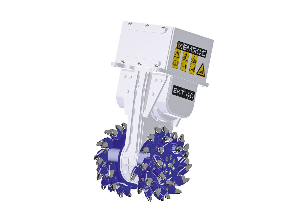 An einem 20-t-Bagger wird am Kemroc-Messestand auf einer 400 m² großen Präsentationsfläche das Modell KRC 140 aus der neuen Baureihe »Bull Head Trencher« mit seinen konisch zueinander angeordneten Schneidköpfen zu sehen sein. Einen weiteren Schwerpunkt bilden – neben einigen Modellen aus den übrigen Baureihen – wie immer die Kettenfräsen der Baureihe EK mit umlaufenden Fräsketten zwischen den beiden Schneidköpfen. Aus diesem Bereich wird das Modell EK 60, ebenfalls am 20-t-Trägergerät, vorgeführt. t