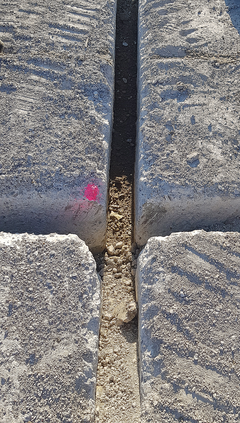 Hier setzte der Maschinist seinen 40-Tonner mit dem Schneidrad an und zerschnitt zunächst den Aufbeton in handhabbare Stücke, deren untere Partien auf 60 cm bis 70 cm Höhe zunächst intakt blieben. Anschließend drang der Bagger mit Schere oder Greiflöffel in den Schlitz zwischen zwei Blöcken und brach je einen Quader aus dem Verband heraus. Die herausgelösten 4 m bis 6 m langen, 1,2 m breiten und 1,7 m bis 1,8 m hohen Betonquader wurden anschließend per Abbruchschere vorzerkleinert, um danach auf einem Mobilbrecher zu Recycling-Material üblicher Korngröße verarbeitet zu werden. Im zweiten Durchgang wurde auf ganzer Bunkerlänge die eigentliche Decke ebenfalls mit dem Schneidrad in Stücke zerkleinert und zu Recycling-Material weiterverarbeitet.