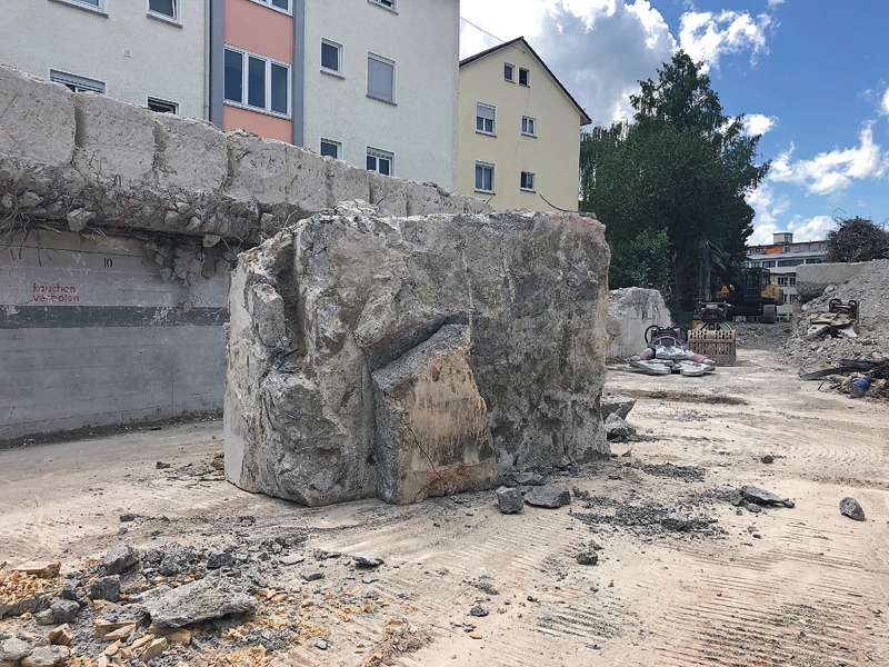 Derselbe Maschinist, der beim Klinikabbruch am Bodensee beteiligt war, ging mit Bagger, kurzem Ausleger und dem Kemroc-Anbaugerät auch in Bad Cannstatt zur Sache. Dabei galt es, zuerst per Schneidrad die Bunkerdecke zu entfernen, um später die Frontwand und die Seitenwände per Seilsäge bodeneben zu durchtrennen. Allein die Decke des Bunkers stellte schon eine Herausforderung dar: Auf 90 m Länge war sie 190 cm dick und stark armiert; der Bewehrungsstahl maß nach Angaben des Baggerführers 30 mm und war in Abständen von 5 cm verlegt. Das restliche Teilstück der Bunkerdecke war zusätzlich von einer 100 cm dicken Schicht aus Aufbeton bedeckt.
