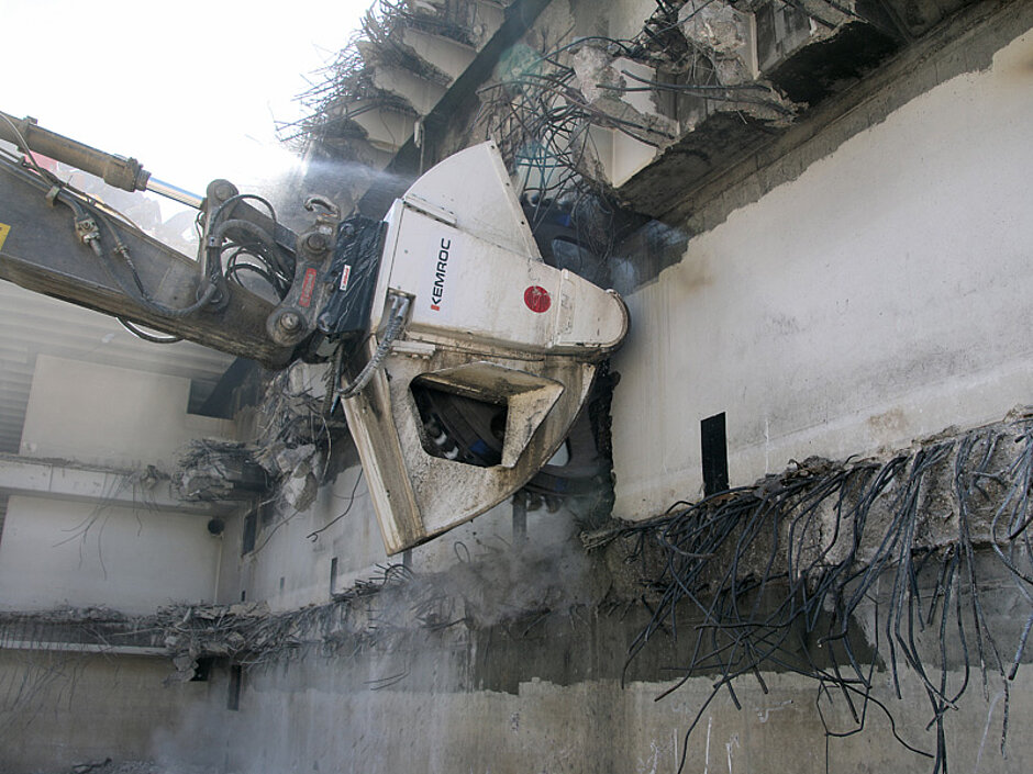 Eine Tiefgarage ist naturgemäß eine massive Betonkonstruktion. Zunächst waren denn auch der Baggerfahrer sowie selbst der Firmenchef Karl Prünstner senior skeptisch gewesen. Dennoch hatte dieser probeweise das Kemroc-Schneidrad angemietet und auf die Baustelle liefern lassen. Dort hatten seine Fachkräfte bereits die Zwischendecken der ehemaligen Tiefgarage auf klassische Weise mit Baggern, Hämmern und Scheren entfernt. Nun waren noch die 18 m hohen, stark armierten Betonwände, eine überschnittene Bohrpfahlwand dahinter sowie die armierte Bodenplatte darunter zu beseitigen. Sein gesamter Abbruch- und Erdbauauftrag war anspruchsvoll: Neben den Betonelementen waren auch 180 000 m³ Erdaushub zu beseitigen – nach einem knapp bemessenen Zeitplan sowie überdies inmitten der Donaustadt auch möglichst geräuscharm.