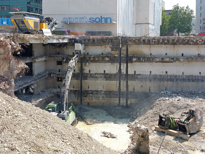 Der Erfolg von Prünstner, einem kleinen, renommierten Unternehmen für Abbruch und Entkernung, beruht darauf, mit besonderen Methoden besondere Aufgaben zu lösen. Etwa im Juni gegenüber des Ulmer Hauptbahnhofs, wo das Unternehmen in Zusammenarbeit mit Züblin Spezialtiefbau eine schlüsselfertige Baugrube für ein neues Geschäfts- und Wohnquartier mit dem Namen erstellt und hierfür zunächst eine ausgediente Tiefgarage beseitigt werden musste. Den Zuschlag für das anspruchsvolle innerstädtische Abbruchprojekt erhielt das Spezialunternehmen Prünstner aus dem nahe gelegenen Ichenhausen. Anstatt mit Hammer und Schere zerlegte dessen 40-t-Bagger mithilfe eines Kemroc-Schneidrades des Typs DMW Erwetor 220 auch stärkste Betonstrukturen fachgerecht in Stücke.