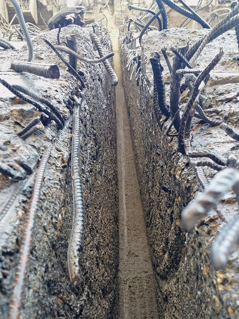 Man konnte sich zunächst nicht vorstellen, dass die Maschine die bis zu 30 mm dicken Bewehrungseisen durchtrennen könnte. Aber schon beim ersten Ansetzen zog der Baggerfahrer in lediglich einer halben Stunde einen 13 m langen, 100 cm tiefen Schnitt in die bewehrte Wandscheibe plus Bohrpfahlwand. Danach waren alle Beteiligten überzeugt und zerlegten die Tiefgarage fachgerecht in Stücke: Zunächst wurde die bewehrte Innenwand von oben nach unten in etwa 4 m breite Streifen geschnitten, die anschließend von einem 100-t-Bagger umgeworfen und mit Hammer und Schere nachzerkleinert wurden. Im zweiten Schritt wurden die schon halb durchtrennten, unbewehrten Bohrpfähle kleingemeißelt sowie im dritten Schritt die bewehrten Bohrpfähle abgehämmert und für die Nachzerkleinerung per Hammer und Schere umgelegt. Schließlich wurde noch die 60 cm bis 80 cm dicke Bodenplatte mit einer Geschwindigkeit von 2 m pro Minute in rund 4 m x 4 m große Stücke zerschnitten, die anschließend umgedreht und auf Bauschutt liegend nachzerkleinert wurden.