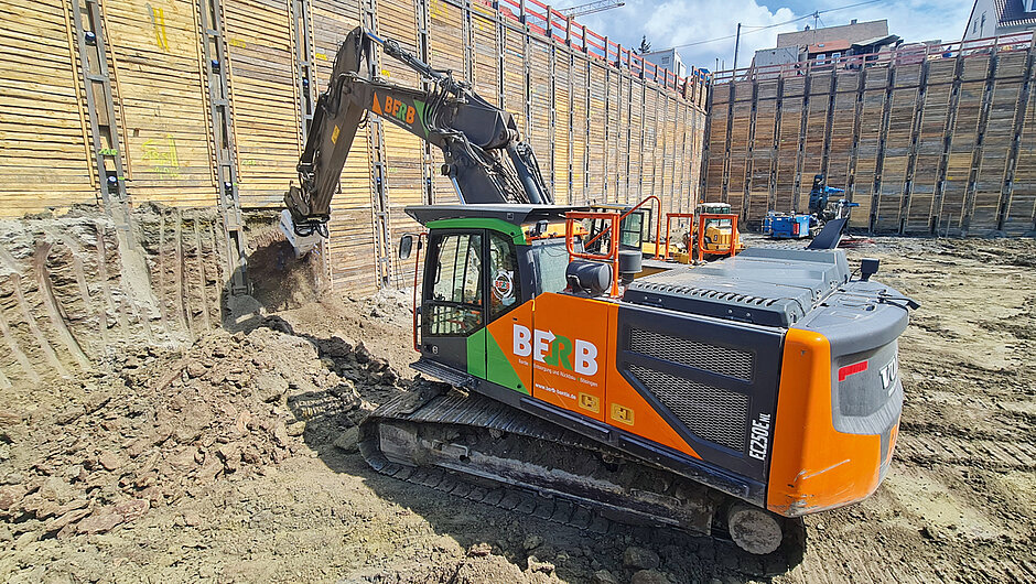 Ein Industrieareal in Leonberg bei Stuttgart verändert sein Gesicht: Hier lässt ein schwäbischer Elektrogerätehersteller anstelle veralteter Infrastruktur einen modernen Gebäudekomplex errichten. Nach dem Rückbau der oberirdischen Gebäudestruktur übernahm das Unternehmen BERB aus Bösingen die Aufgabe, das Kellergeschoss inklusive Betonfundament zu beseitigen, sowie die 6 000 m² große Baugrube auszukoffern und zu sichern. Schnell und rationell gelang dabei das Einziehen des Trägerbohlenverbaus dank einer Querschneidkopffräse KRD 120 (120 kW) mit einem Rotator KRM 60 – beides von Kemroc – am firmeneigenen Kettenbagger.