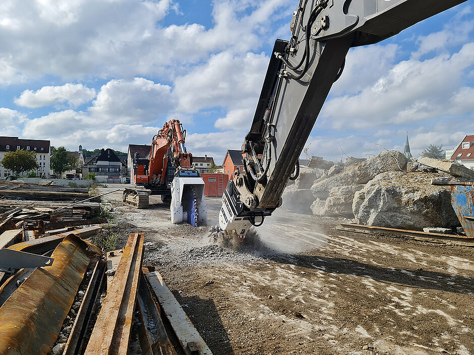 Nachdem die Mannschaft rund um den Firmenchef Markus Christadler schon im Vorlauf die oberirdischen Gebäudeteile abgebrochen hatte, beseitigen die Fachleute nunmehr seit Juli 2022 die mächtigen unterirdischen Bestandteile. Eine Besonderheit an diesem Abbruchprojekt: Der Industriekomplex gehörte einem Betrieb für Stahlumformung, und entsprechend solide hatte man die Betonfundamente der Fertigungsstätten ausgelegt. Einzelne Elemente erreichen laut dem Abbruchunternehmer 1.500 m³ Einzelmasse. Eine zweite Besonderheit: Diese Arbeiten in innerstädtischer Lage waren gemäß einer Auflage bei der Vergabe weitestgehend geräusch- und erschütterungsarm auszuführen.