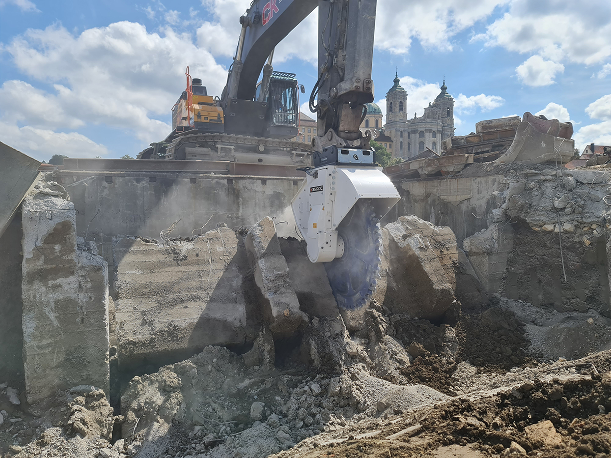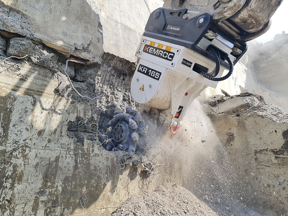 Die Schneidräder der Baureihe DMW von Kemroc sollen hohe Leistungen in hartem Gestein und bewehrtem Stahlbeton erzielen. Auf der Baustelle von CK Abbruch in Weingarten werden die Schneidräder verwendet, um großvolumige Bauteile wirtschaftlich in kleinere Einzelstücke zu zerlegen. Diese werden anschließend mit Zangen und Scheren brechergerecht aufbereitet. „Eine unnötige, geräusch- und erschütterungsreiche Vorzerkleinerung, wie sie beim Hämmern unvermeidbar ist, können wir damit weitgehend ausschließen“, erklärt Markus Christadler. Die schmalen Werkzeugprofile der Schneidräder helfen außerdem dabei, die Erzeugung von wertlosem Feinkorn sowie den Kraftstoffverbrauch und Werkzeugverschleiß gering zu halten.