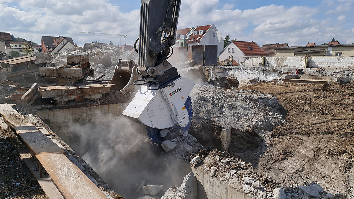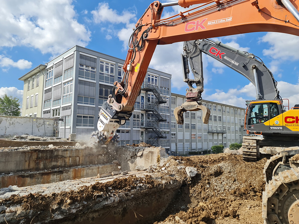 Aktuell zeigt das Unternehmen CK Abbruch und Erdbau bei einem Einsatz im süddeutschen Weingarten, wie ein Gebäudeabbruch geräusch- und erschütterungsarm umgesetzt werden kann. In der Innenstadt werden die Fundamente eines früheren Industriekomplexes beseitigt. Mit Anbaufräsen und Schneidrädern von Kemroc an Hydraulikbaggern werden die schweren Betonelemente wirtschaftlich sowie schonend für Anwohner und Umwelt zerlegt.