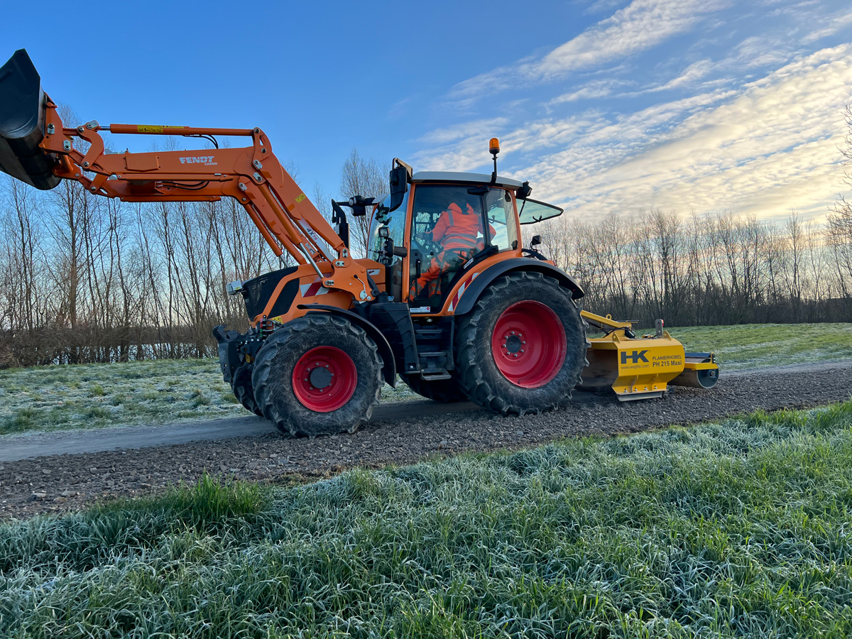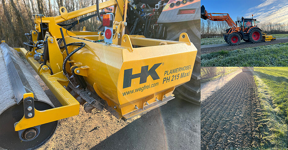 Hier kommt der Maxi zum Einsatz, dessen hydraulisch absenkbare Zähne die Oberfläche des Weges bis zu 8 cm tief aufreißen, um eine gleichmäßige Verzahnung von ausgefahrenen Schlaglöchern wiederherzustellen. Durch die Form der Rückwand wird das Material im Hobel vermischt und mittels Verteilerschild vermehrt in die Wegmitte gebracht. Dadurch entsteht ein Dachprofil, das Regen einfach abfließen lässt. Eine sinnvolle Arbeitsweise, wie Werkstattleiter Daniel Klug des Bauhofs Kalkar berichtet: „Mit unserem alten Planierhobel konnten wir Material nur bewegen, nicht mitführen.“ Auch Andreas Thissen, der stellvertretende Betriebsleiter des Bauhofs sieht in der Funktion eine gelungene Ergänzung: „Man muss bei solchen Aufgaben einfach mit dem vorhandenen Material arbeiten.“