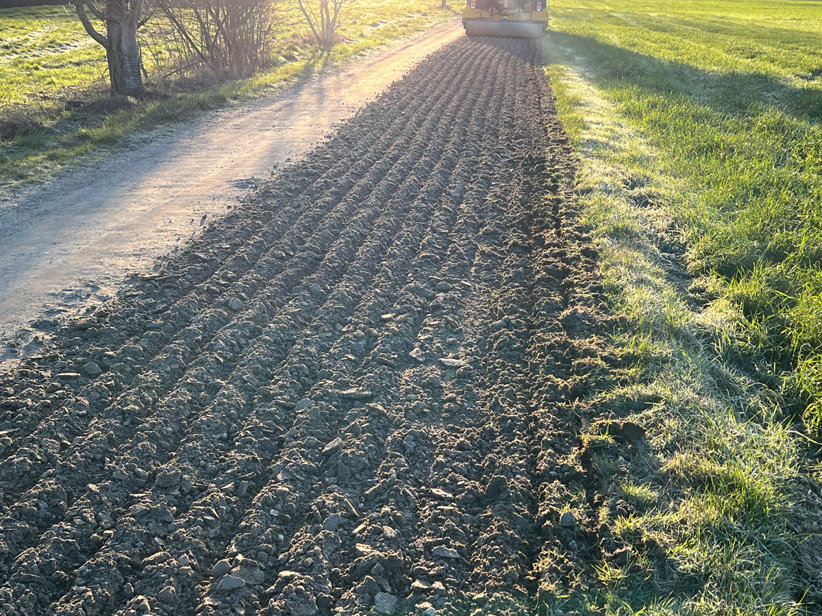 Nach einer Vorprofilierung mit der neu erzeugten Mischung lässt sich die neue Oberfläche anschließend mit dem HK Planierhobel statisch verdichten. Um eine größere Verdichtung zu realisieren, kann die Walze zusätzlich mit Wasser befüllt werden.
