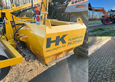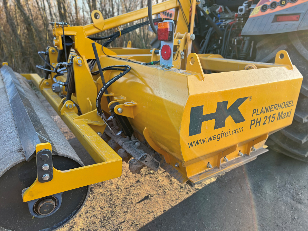 Hier kommt der Maxi zum Einsatz, dessen hydraulisch absenkbare Zähne die Oberfläche des Weges bis zu 8 cm tief aufreißen, um eine gleichmäßige Verzahnung von ausgefahrenen Schlaglöchern wiederherzustellen. Durch die Form der Rückwand wird das Material im Hobel vermischt und mittels Verteilerschild vermehrt in die Wegmitte gebracht. Dadurch entsteht ein Dachprofil, das Regen einfach abfließen lässt. Nach einer Vorprofilierung mit der neu erzeugten Mischung lässt sich die neue Oberfläche anschließend mit dem HK Planierhobel statisch verdichten. Um eine größere Verdichtung zu realisieren, kann die Walze zusätzlich mit Wasser befüllt werden.
