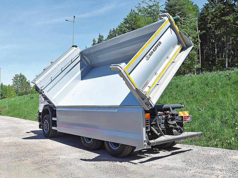Mit der neuen Lösung will KH-Kipper eine präzisere Entladung des Materials in geringem Abstand vom Fahrzeug ermöglichen. Diese Option wird häufig bei der Straßeninstandsetzung verwendet und erhöht die Funktionalität des Fahrzeugs entsprechend. Die Seitenwandkonstruktion sowie Steuerfunktionen bleiben im Vergleich zum gewohnten System unverändert. t