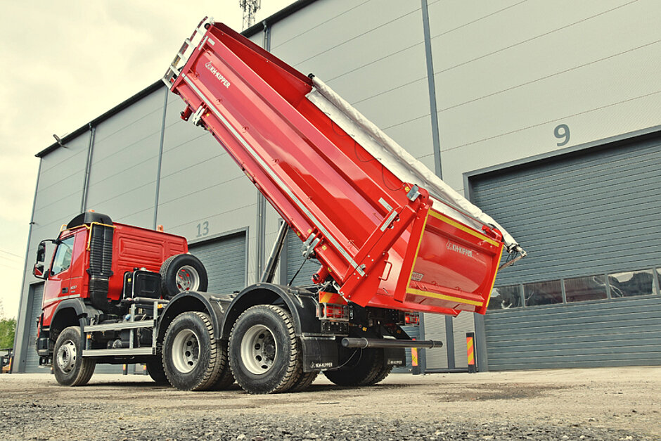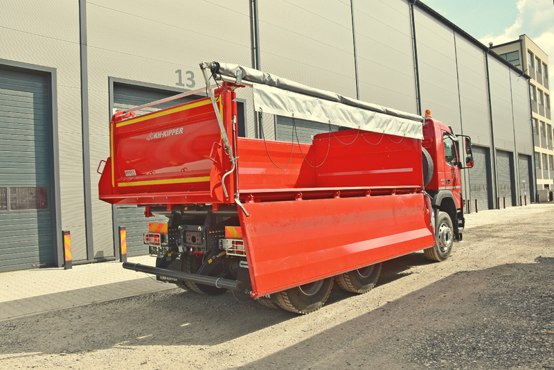 Die Heckwand öffnet automatisch bei angehobener Kippbrücke und schließt beim Absenken. Die Heckschütte, die sich auf dem selben Niveau wie der Kipperboden befindet, ermöglicht das glatte Entladen von Schüttgut. Die Heckschütte lässt sich bei Bedarf demontieren.