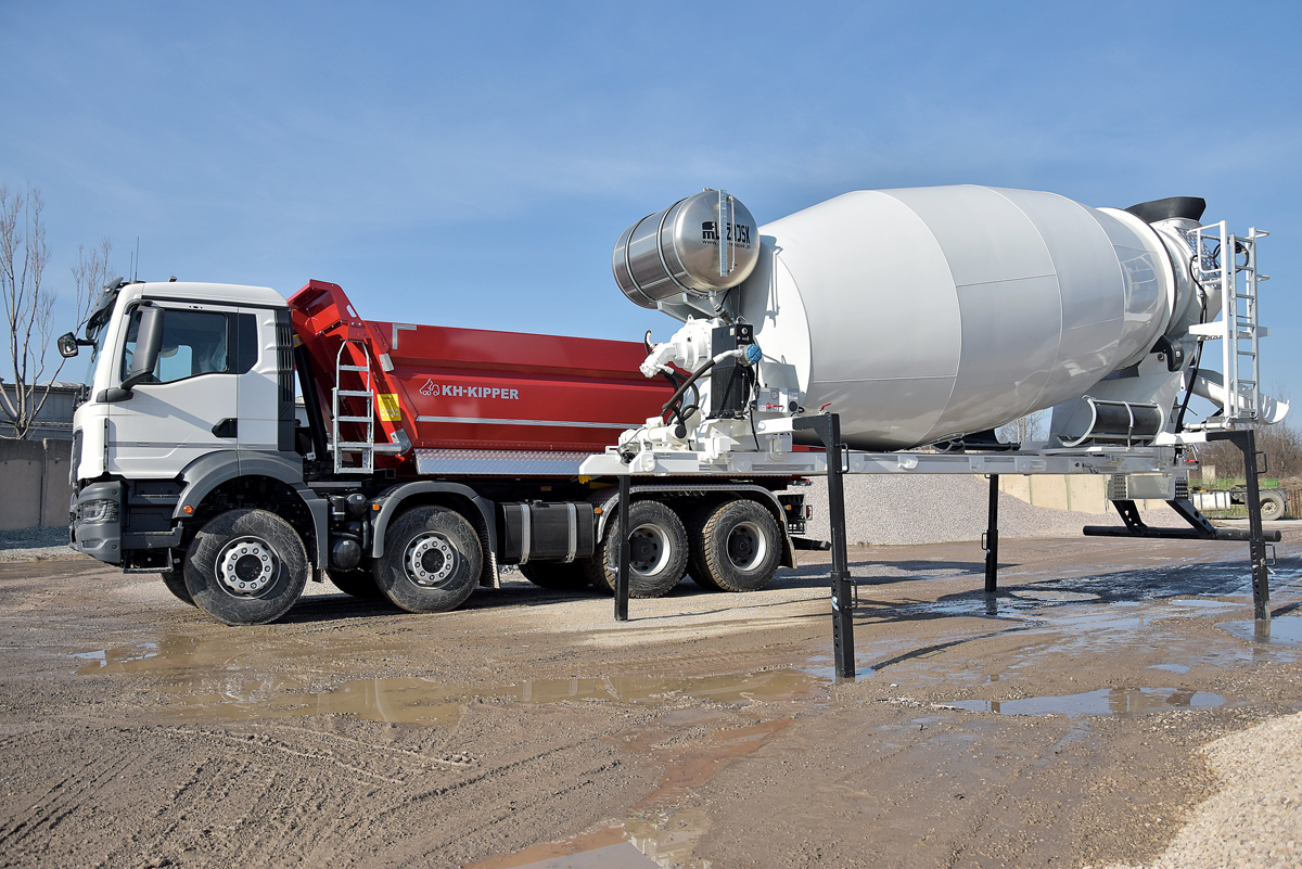 Ein Wechselsystem erhöht die Fahrzeugfunktionalität, indem es Lkw-Aufbaukonfigurationen – Kipper, Betonmischer oder andere – entsprechend der aktuellen Anforderungen ermöglicht. Das von KH-Kipper vorgestellte System umfasst ein Lkw-Fahrgestell mit Kippaufbau und einen Betonmischer auf Stützbeinen. Die Lösung von KH-Kipper erlaubt es, mit nur einem Fahrgestell zwei Wechselaufbauten zu nutzen und die jeweils nicht genützte Lösung auf Stützen zu lagern. Der Wechsel vom Dreiseitenkipper zum Betonmischer erfordert laut Anbieter nur ein bis zwei Personen und nimmt wenige Minuten in Anspruch. KH-Kipper demonstrierte das Wechselsystem mit einem Dreiseitenkipper auf einem MAN-8x4-Fahrgestell. t