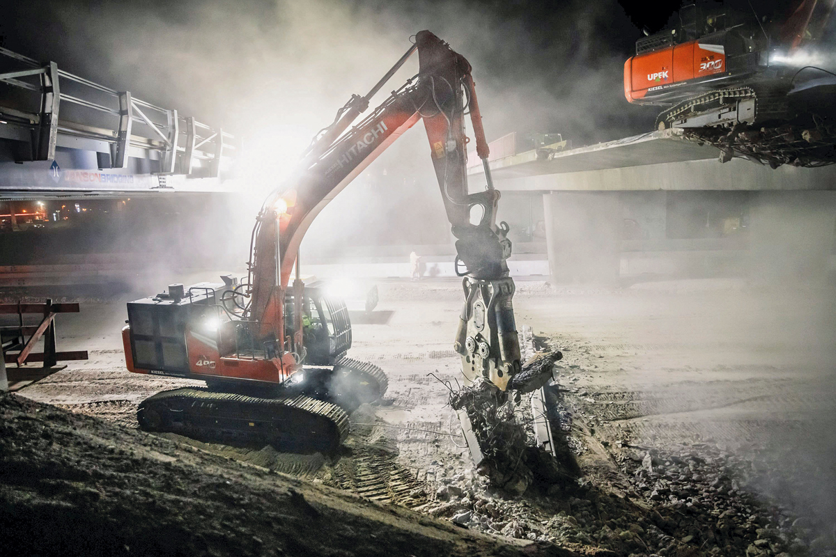 Das Vorhaben klingt anspruchsvoll und ist es auch. Nicht zuletzt, weil über Nacht gearbeitet werden muss und dabei Baumaschinen mit unterschiedlichen Anbaugeräten ohne Unterbrechungen zum Einsatz kommen. Peter Steltner, Prokurist bei Upek, weiß genau, worauf es beim Brückenabriss ankommt: Einerseits sollen fähige Mitarbeiter in den Baggern sitzen, andererseits muss auch auf die Technik Verlass sein. Auch wenn der eigene Maschinenpark von Upek gut bestückt ist und bei diesem Projekt der KMC600P-6 von KTEG und der Hitachi ZX300LCN-6 eingesetzt werden, greift man dennoch bei komplexen Baumaßnahmen auf die zeitlich begrenzte Nutzung von gemietetem Equipment zurück. Der Abbruch-Spezialist betont: »Der Kiesel Mietpark ist für uns von Vorteil, da leistungsstarke Bagger und passende Anbaugeräte kurzfristig für Auftragsspitzen verfügbar sind.« Und Niklas Pieters, Mietparkleiter der Niederlassung Bielefeld von Kiesel Nord, bestätigt: »Da der Bagger projektbezogen eingesetzt werden sollte, hat sich die Firma Upek für das Mieten eines Hitachi-Großbaggers entschieden. Gemeinsam hatten wir die Aufgabenstellung detailliert besprochen, sodass wir die passende Maschine inklusive Zubehör auswählen konnten. Mit diesem Setup boten wir dem Kunden die perfekte Maschinengrundlage für den anspruchsvollen Brückenabriss.«