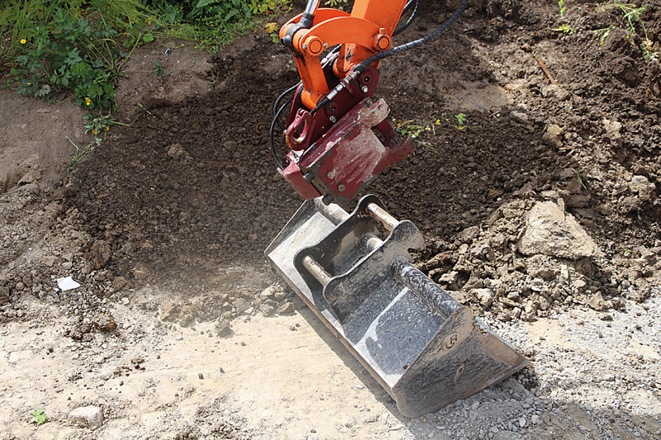 Anschließend bearbeitet er mit einer Grabenräumwanne eine Böschung, die entstanden war, um das Gefälle vom Haus wegzuführen und dem Grundstück einen vernünftigen Abschluss zu geben. Der Maschinenführer zeigt sich mit der feinfühligen Handhabung und der schnellen Ansprache des ZX19U-5 sehr zufrieden. Durch den Einsatz des Powertilts kann er die Anbaugeräte so drehen, wie es notwendig ist und kommt ohne zu häufiges Versetzen der Maschine überall hin. »Durch den Schnellwechsler wechselt man lieber einmal mehr auf den passenden Löffel, wenn man dafür die Kabine nicht verlassen muss«, erklärt Andreas Fritsch.