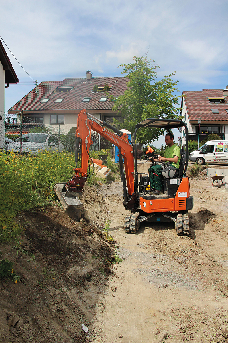 In vielen Wohngebieten besteht nach Auskunft von Andreas Fritsch, Gärtnermeister und Ausbilder bei Wildigarten, das Problem, dass die Grundstücke an sich und die Zufahrten dorthin immer enger werden. Da ist es hilfreich, wenn man mit sehr kompakten Maschinen, die per Pkw-Anhänger transportiert werden können, arbeitet. Durch verschiedene Anbaugeräte und die Ausrüstung der Bagger mit Powertilt werden auch die kleinsten Maschinen zu multifunktionalen Geräteträgern, die unterschiedlichste Aufgaben ausführen: Der Hitachi ZX19U-5 beispielsweise zieht schmale Gräben für die Dränagen, Entwässerungsleitungen und Regenfallrohre. Auch zum Einebnen von Roh- und Oberboden oder beim Modellieren des Gartengeländes ist er geeignet. Immer wieder wird er in kleinen und engen Gärten auch zum Kranersatz und hebt Mauersteine oder hilft Treppenstufen zu setzen.