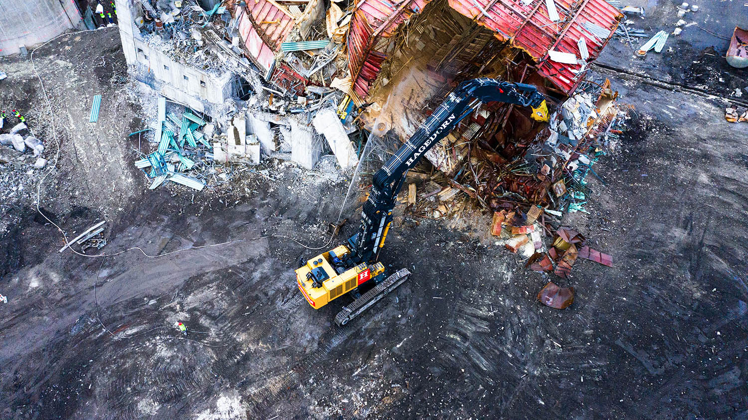 Unmittelbar im Anschluss ging es an die Arbeit. Dabei zeigte der KMC1600S eindrucksvoll seine Leistungsfähigkeit, Kraft und Reichweite. Dank der verschiedenen Ausleger, wie der Tele-High-Reach-Ausrüstung, die er je nach Einsatz ankoppelt, ist er in der Lage, Abbrüche bis zu einer Höhe von 60 Metern auszuführen. Parallel dazu greift er je nach Einsatzanforderung auf eine sogenannte Triple-Boom-Ausrüstung zurück, die durch den Einsatz von Verlängerungsstücken schrittweise von 21 auf bis zu 36 Metern erweitert werden kann.