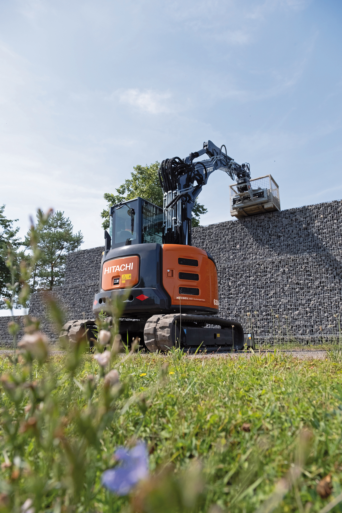 Der Clou an dieser Maschine ist, dass hier das Konzept mit einem neben der Kabine angelenkten Ausleger von einem großen Kettenbagger auf eine Kompaktmaschine übertragen wurde. »Dadurch können wir höhere Hubkräfte, also konkret 2,5 t bei 2,5 t Ausladung, erzielen«, erklärt Mesmer. Hinzu kommt, dass so die Sicht auf den Arbeitsbereich nicht durch einen Schwenkbock vor der Kabine beeinträchtigt wird. Durch den Rotationsschnellwechsler hat der Fahrer dennoch eine sehr große Flexibilität, um alle erforderlichen Maßnahmen umsetzen zu können. Das ist für jeden Fahrer eine riesengroße Erleichterung. Mit dem neuen Kompaktbagger KTEG 63US-6 bringt Kiesel einen Allrounder auf den Markt, der auf beengten Baustellen und auf minimalem Raum mehr kann als andere Maschinen. »Hinten kurz, vorne kurz und ein kompakter Verstellausleger«, so Mesmer, »da freuen sich die Baggerfahrer. Alles ist da, wie gewünscht. An dieser Stelle ist die Geschichte aber noch nicht zu Ende.« Der umgebaute Kompaktbagger wird auf der Testbaustelle im Coreum auf Herz und Nieren geprüft, bevor der Bauunternehmer, der den Wunsch geäußert hatte, ihn testen kann.