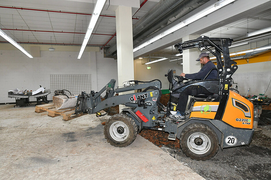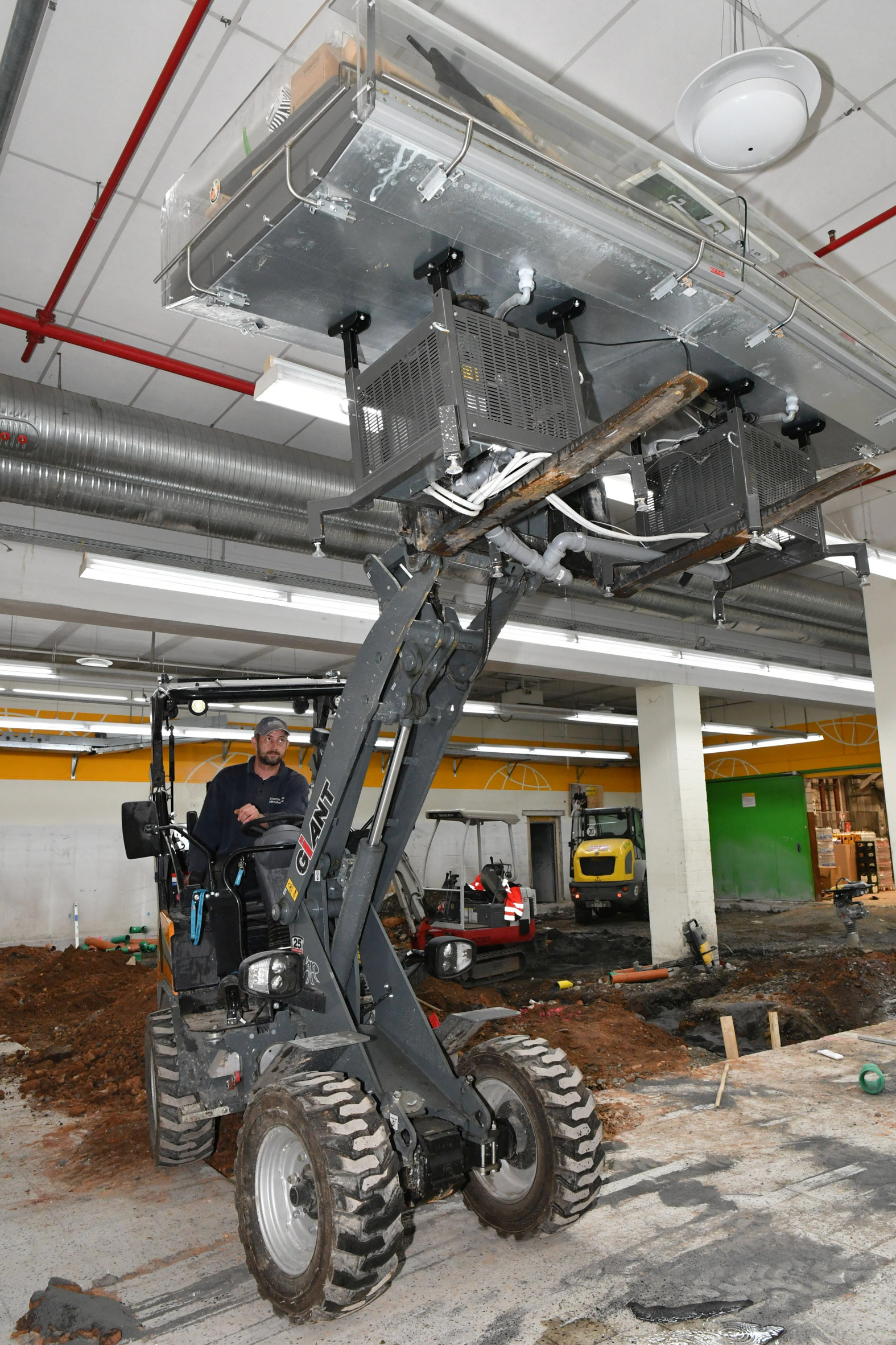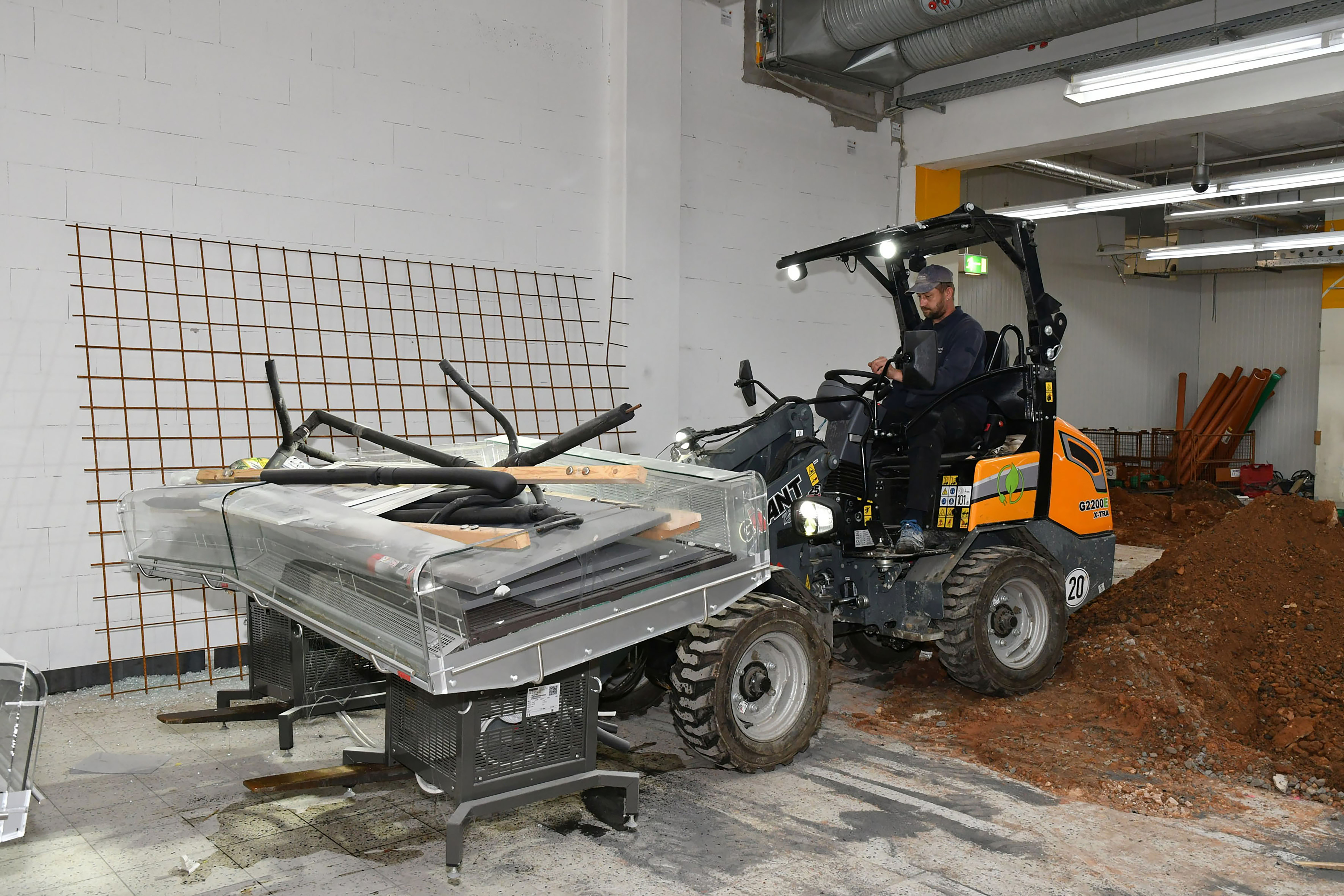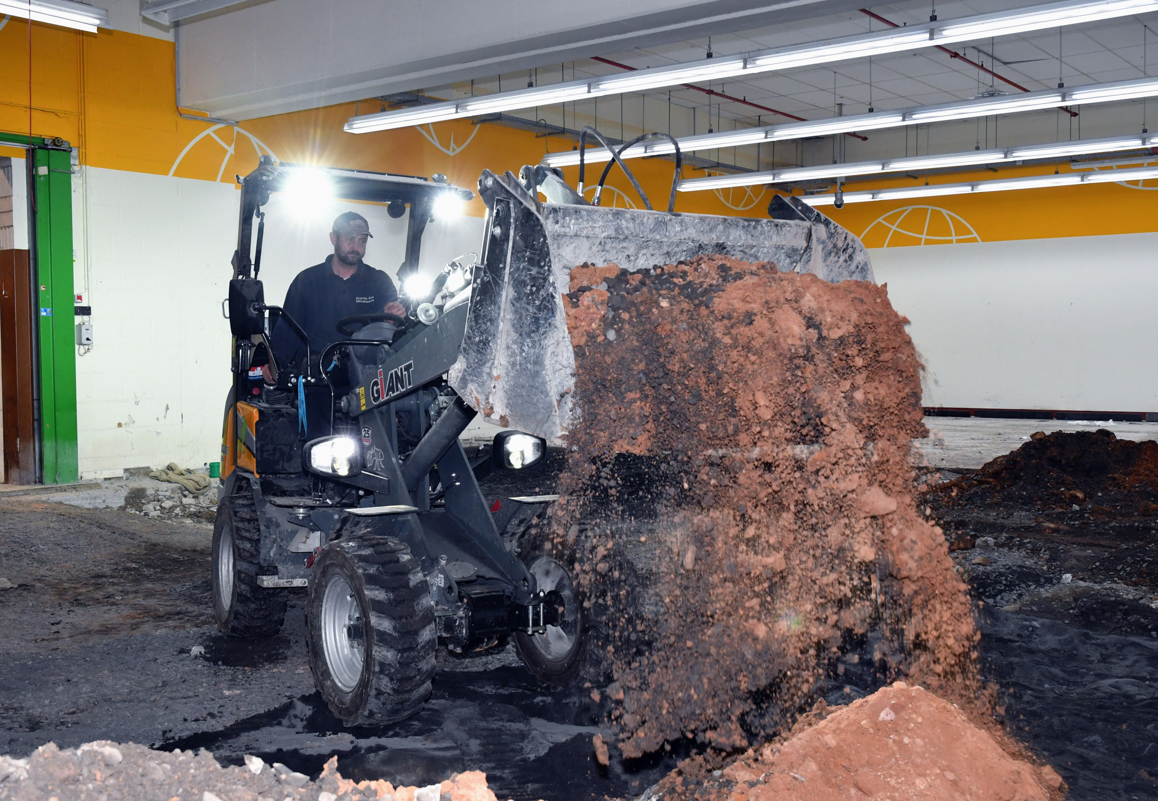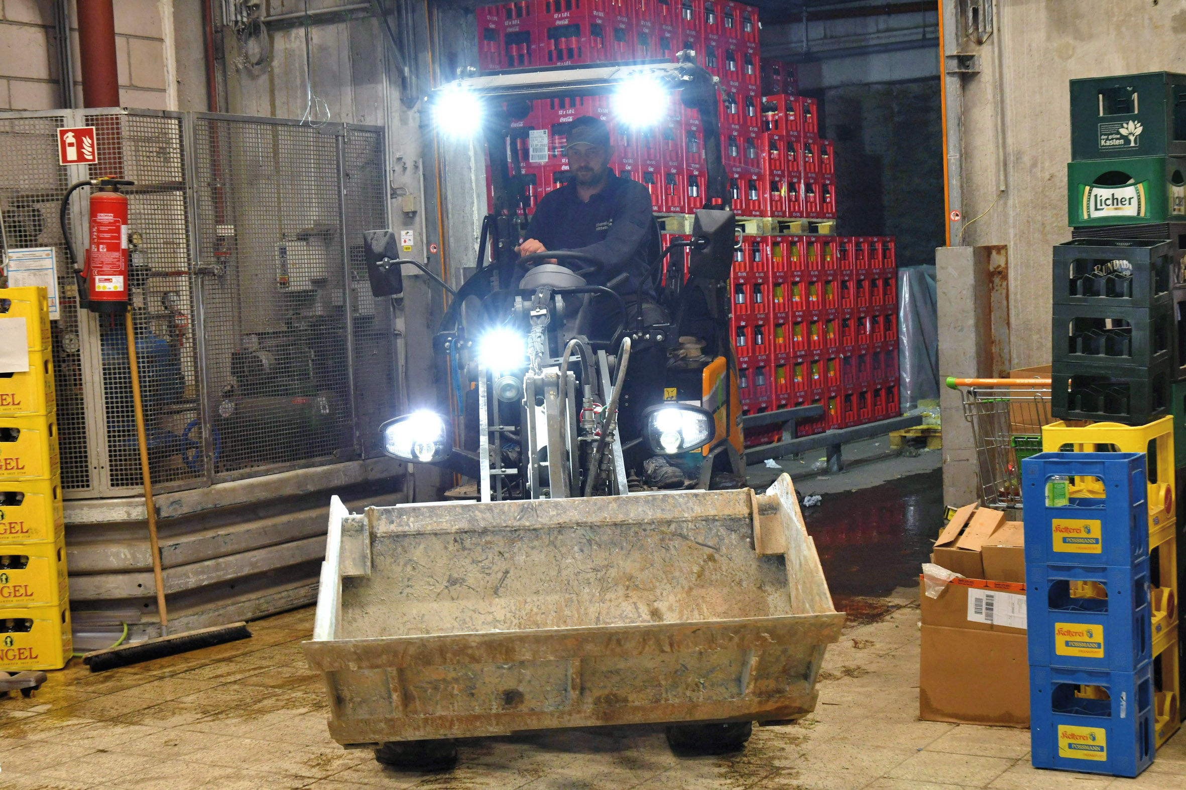 Mitten in einer aufgelösten Getränkemarkt-Abteilung fährt der orangenfarbene Radlader mit eingeschalteten kräftigen LED-Strahlern. Nachdem der Giant G2200E X-tra mit der Palettengabel letzte Installations-Module aus der Halle weggeräumt hat, wechselt der Bediener Silvio Mahrhold das Anbaugerät und nimmt eine Schaufel auf.