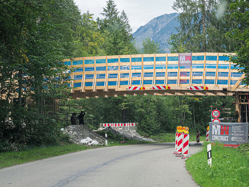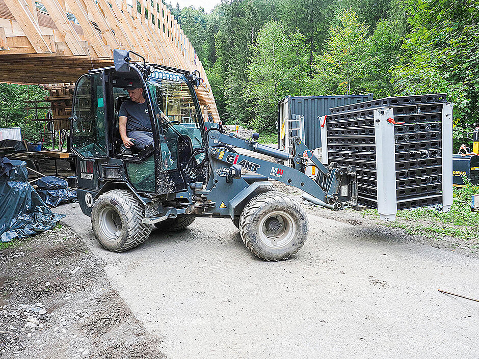Auf der einen Straßenseite fließt die Stillach, auf der anderen begrenzt eine Sommerübungsstrecke für Freizeit- und Profisportler das Gelände. Viel Platz hat das Team von MW Construct nicht, um Maschinen und Material unterzubringen.