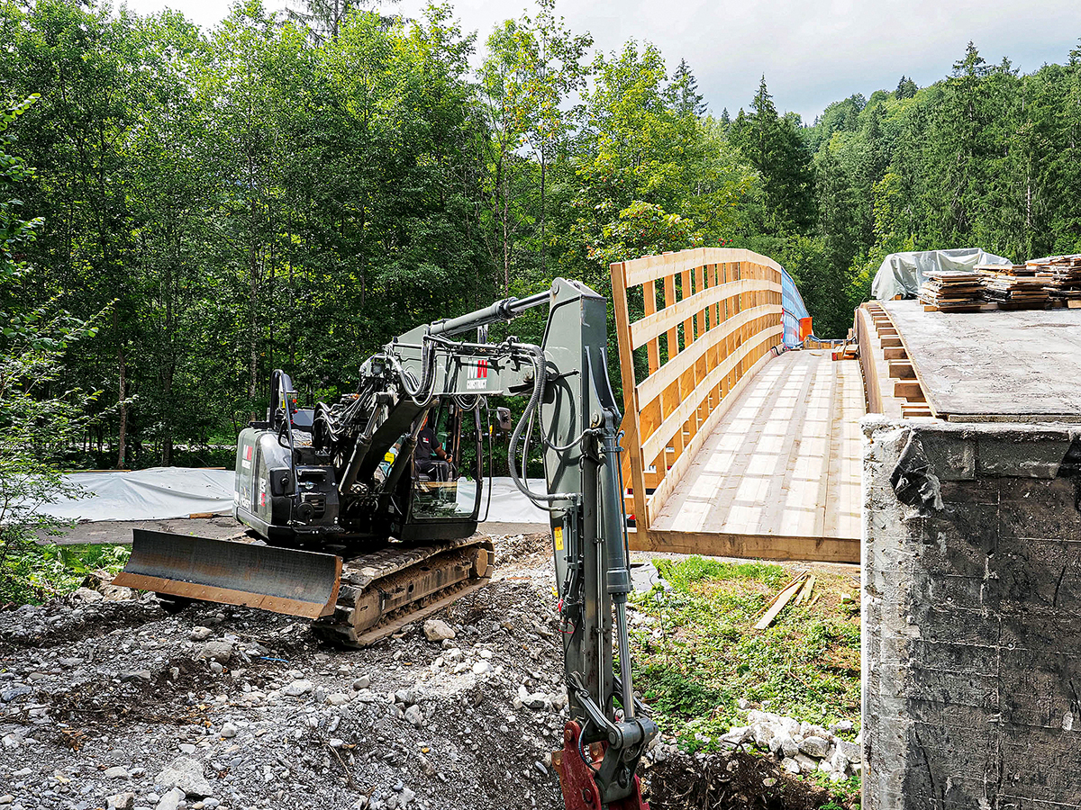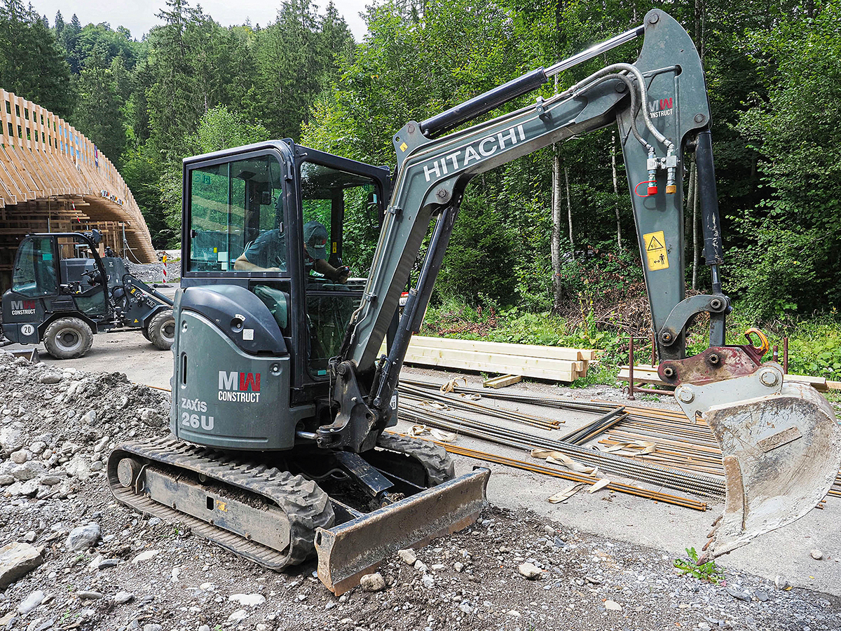 Die im Jahr 2003 errichtete und aus Brettschichtholz gefertigte Loipenbrücke ruht auf Betonpfeilern. Damit moderne Schneepflüge ausreichend Platz haben, muss sie verbreitert werden. »Ein Teil des Stahlbetons der Widerlager und Pfeiler musste abgebrochen werden, der Rest wird wieder neu umbaut«, erklärt Bernd Schmitt, der die Baustelle leitet. »Der Schalaufwand ist anspruchsvoll. Hier ist gutes, altes Handwerk gefragt.« Für die Aushub- und Sanierungsarbeiten stehen der Hitachi-Minibagger 26U, der Hitachi-Raupenbagger ZX135US-6 und der Giant-Radlader 452xtra-HD bereit.