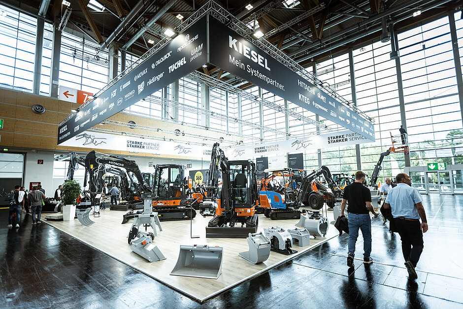 Eines der Messe-Highlights sind die innovativen Systeme der KTEG P-Line. Bei der Entwicklung stand laut Kiesel die Beschleunigung von Prozessen im Vordergrund, wie ein Gerätewechsel in zehn Sekunden, 360°-Rotation, optimierte Anbaugeräte und digitale Assistenzsysteme. Darüber hinaus ist Kiesel seit über 20 Jahren Exklusivhändler für Hitachi. Gerade für den GaLaBau-Bereich zeichnen sich die Mini- und Kompaktbagger des Herstellers durch ihre Benutzerfreundlichkeit und Robustheit aus. Außerdem bietet Kiesel hier für jede Einsatzmöglichkeit das perfekte Anbaugerät.