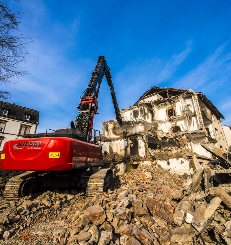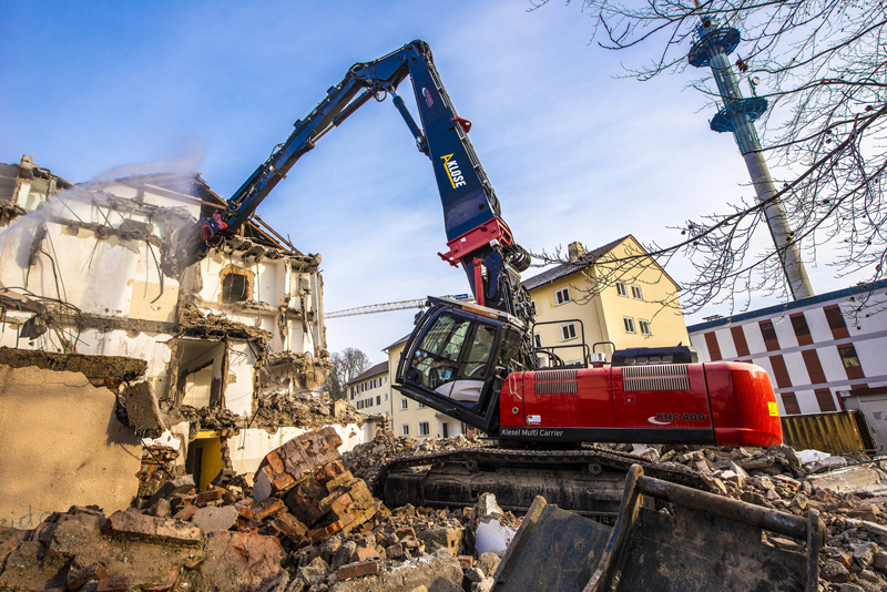 Beim Abbruch alter Ziegelgebäude in Lahr im Schwarzwald hatte er seinen ersten anspruchsvollen Einsatz: Der neue Kiesel Multi Carrier KMC400 war hier über drei Wochen mit verschiedenen Anbaugeräten damit beschäftigt, rund 14.000 m3 umbauten Raum zurückzubauen und zu sortieren. Er zeigte sich als überaus geeignet für diese Aufgabe.