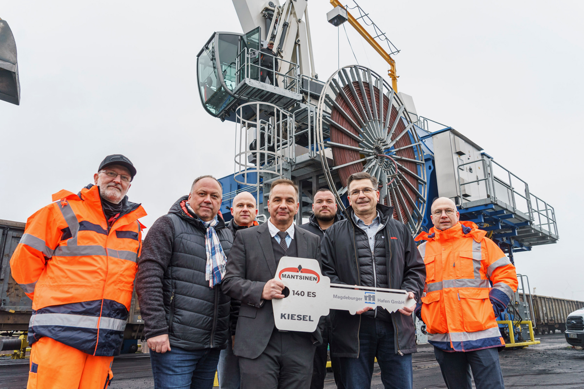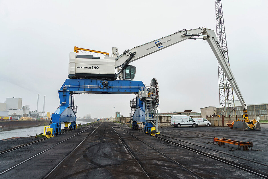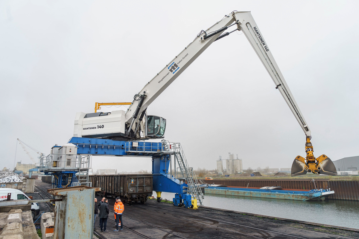 Bei der folgenden Ausschreibung setzte sich das Konzept von Kiesel durch. Drei veraltete Seilkräne sollten durch eine schienengebundene180 t Hydraulik-Portal-Materialumschlagmaschine Mantsinen 140ES und eine radmobile 85 t Materialumschlagmaschine Mantsinen 70M für den Hinterlandbetrieb im Hafen ersetzt werden. Das Maschinenduo konnte gleich mehrfach punkten. Zum einen überzeugte das Baukastenprinzip von Mantsinen, mit dem Unterbau, Ausleger und Kabine individuell zusammengestellt werden können. Zum anderen fügen sich die Maschinen optimal in das Konzept Greenport ein, mit dem im Magdeburger Hafen an einer nachhaltigen Zukunft gearbeitet wird.