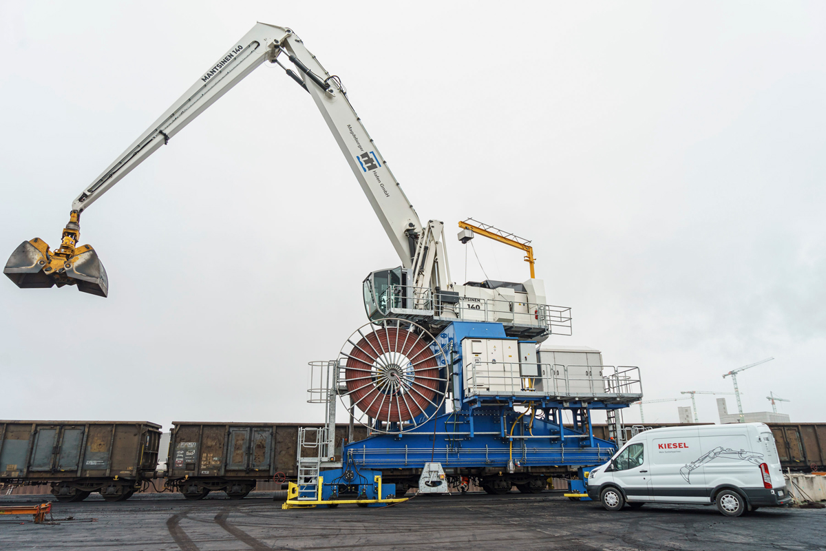 Die Hauptarbeit übernimmt darum der Mantsinen 140ES mit seinem kraftvollen 250 kW Elektromotor. In Spitzenzeiten und abseits der Schienen ergänzt ihn der vollgummibereifte Mantsinen 70M mit seinem 265 kW starken Dieselmotor. Beide Maschinen verfügen über die Mantsinen HybriLift-Technologie. „Beim Absenken des Auslegers wird die Energie in Stickstoffkammern im Oberwagen gespeichert“ erklärt Henry Berthold, Vertriebsleiter Materialumschlag bei Kiesel. Mit dem Hub nach oben wird diese Energie der Hydraulik zur Verfügung gestellt. Das spart bis zu 35 % Energie. „Und die Hydrauliköle sind zudem komplett biologisch abbaubar“ ergänzt Dr. Maly.