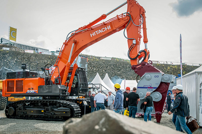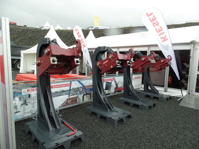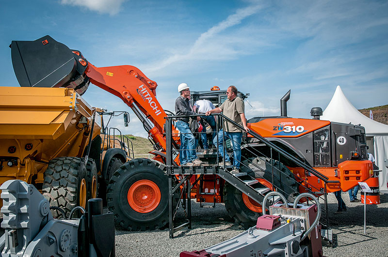Als Paradebeispiel für eine am Kundenbedürfnis entwickelte Maschine stellte Kiesel den Hitachi ZX-890-6 vor, der während der Messe im Dauereinsatz war. Ein verstärkter Fahrmotorschutz und die robuste Leitradaufnahme prädestinieren den ZX890-6 neben einer leistungsfähigen Hydraulik zu einem Arbeitstier in Gewinnungsbetrieben. Mit umkehrbaren Lüftern und einem leicht wechselbaren Kraftstoffhauptfilter zeigt er sich den Anforderungen in staubintensiven Arbeitsumgebungen gewachsen.