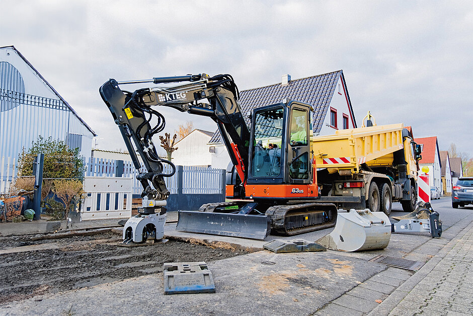 Der »KTEG 63US-6« wurde aus einer völlig anderen Richtung gedacht: Die Ingenieure übertrugen das Konzept eines größeren Hydraulikbaggers auf eine Kompaktmaschine. Das Ergebnis: Eine kurze und gleichzeitig kraftvolle 6,5-t-Maschine, die mit hohen Hubkräften von über 2,5 t glänzt. Der seitlich neben der Kabine gelagerte Ausleger sorgt für beste Sicht auf den Arbeitsbereich – ein wichtiger Vorteil bei innerstädtischen Bauarbeiten. Beide Maschinen können mit der »KTEG P-Line« ausgestattet werden – einem System aus Multi-Tool-Carrier, Rotationsschnellwechsler, optimierten Anbaugeräten und digitalen Assistenzsystemen. Mehr Flexibilität, mehr Produktivität, mehr Möglichkeiten – genau das, was die Branche fordert.