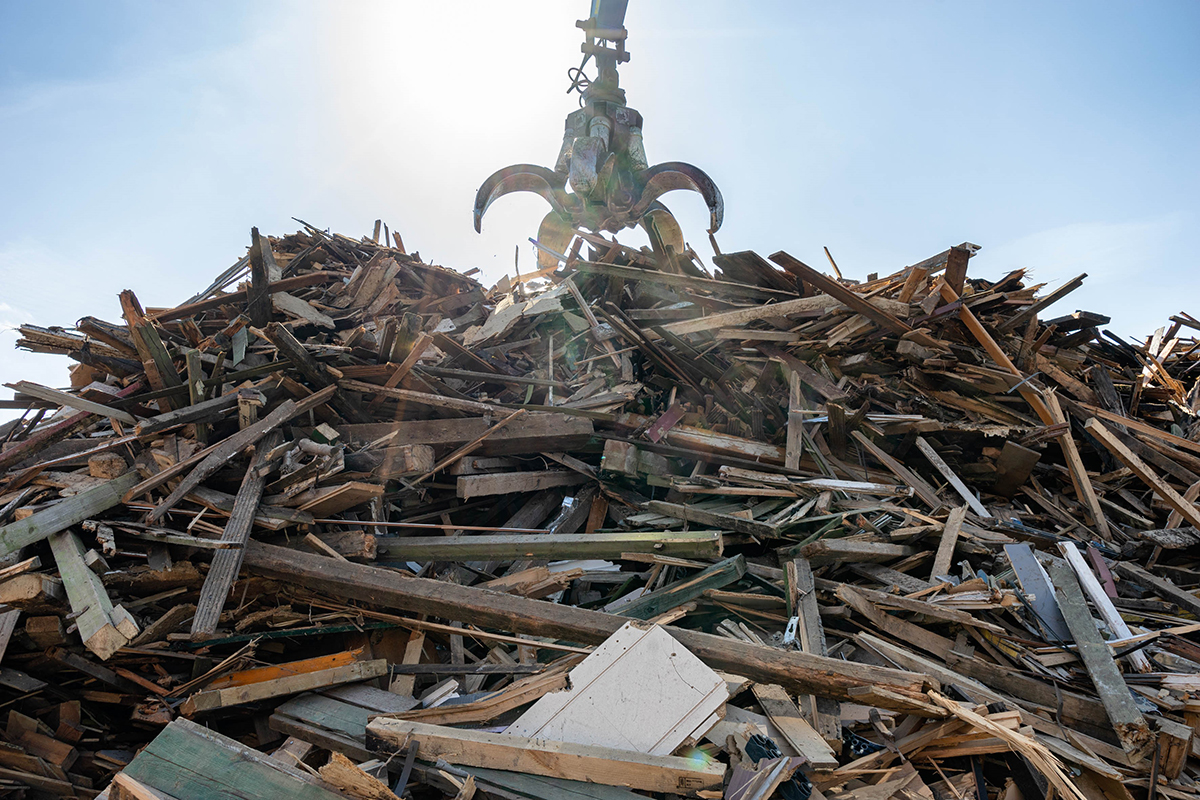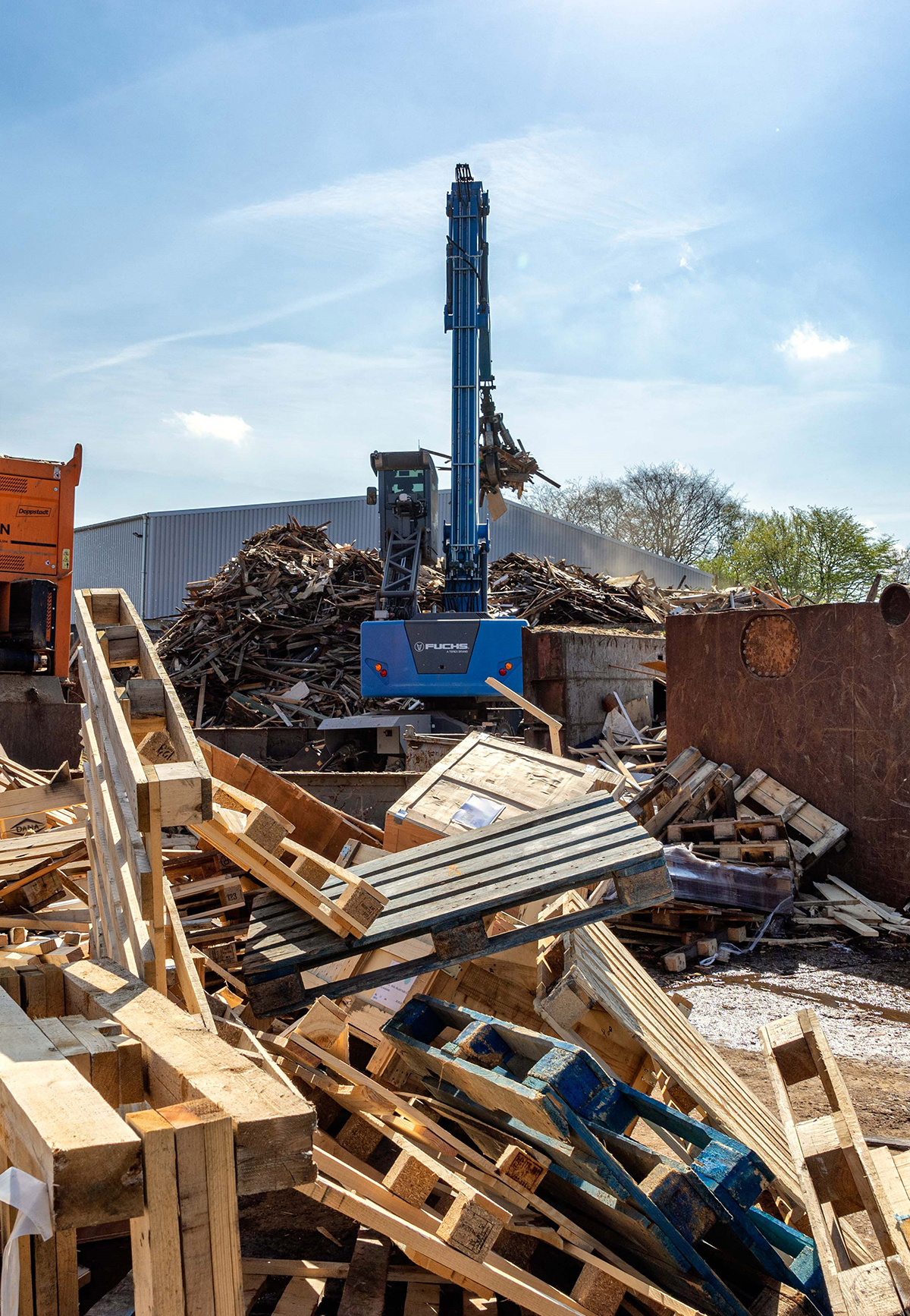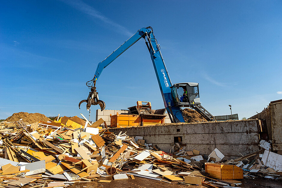 Der 40-Tonner mit einer Ausladung von 17 Metern befüllt den Holzschredder. Aus drei Boxen entnimmt der Polypgreifer Vormaterial unterschiedlicher Größen wie Gartenholz, Schränke, Spanplatten bis zu Paletten und führt dieses dem Schredder zu. Die Unterwagenbreite von drei Metern garantiert beim Heben zusammen mit vier Pratzen einen sicheren Stand. Ein mechanischer Schnellwechsler kommt zum Einsatz, wenn mit der Elektromagnetanlage das zweite Anbaugerät benötigt wird. Was allerdings selten der Fall ist, der Polypgreifer stemmt fast den gesamten Job.