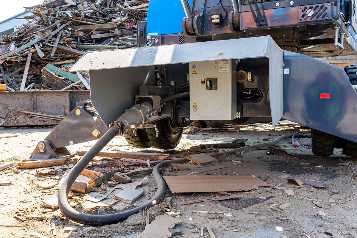 Vorbehalte bei der Mannschaft, was das Ändern des „running System“ angeht, kennt jeder Unternehmer. Auch bei der F. Ehrich GmbH stieß der Umstieg von Diesel auf Elektro bei „alten Hasen“ auf Stirnrunzeln. Wird die Mobilität durch das Stromkabel eingeschränkt? Was tun, wenn eine Maschine ausfällt und der Elektrobagger woanders zum Einsatz kommen und damit entsprechend bewegt werden muss? Natürlich wurden diese Aspekte bedacht. Statt die Maschine fest zu installieren, sorgt ein Fahrwerk für gewünschte Beweglichkeit. Ein Stromkabel garantiert die Versorgung, und da der Fuchs MHL850F lediglich Strecken von wenigen Metern zurücklegt, ist eine aufwändigere Kabelführung hier kein Thema.