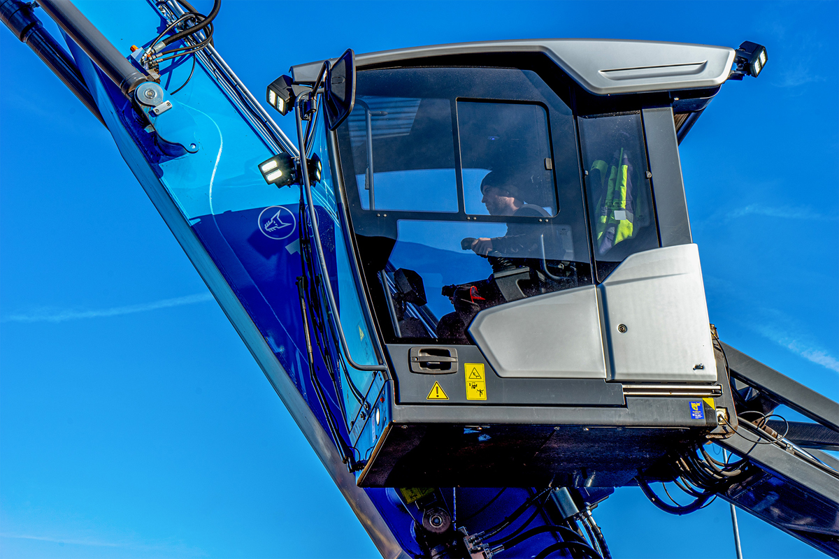 Die Sonderausstattung der Bagger beinhaltet Vorfilter, die auch kleinste Schmutz- und Metallpartikel vom Kreislauf trennen und dadurch Hydraulikkomponenten schützen, teilt der Systempartner Kiesel mit. Das ist dem Senior-Chef wichtig, denn er setzt auf Nachhaltigkeit bei seinen Maschinen. Eine weitere Spezialität ist die "Banane", eine Krümmung des Auslegers. Durch diese Krümmung erreicht der Ausleger auch die tiefsten Winkel von Frachträumen. Auf einer Höhe von bis zu sechs Metern operiert die Kabine und gewährt dem Fahrer optimale Sicht, so Kiesel. Die Bagger sind durch Bereifung voll beweglich, Pratzen gewähren zudem einen festen Stand beim Stemmen der Fracht. Als Anbaugeräte sind Schalengreifer, Polypengreifer und Holzzangen verschiedener Größen für die unterschiedlichen Holz- und Schüttgutladungen im Einsatz.