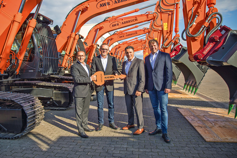 Die Urmitzer Abbruchspezialisten AWR wappnen sich für neue Großaufträge und bestellten beim Systempartner Kiesel gleich zehn der dafür nötigen Maschinen. Stephan Bales, Vertreter bei Kiesel West: »Ein solcher Großauftrag ist nicht alltäglich und deshalb ehrt und verpflichtet er uns in besonderem Maße. Der langjährige Kunde AWR Abbruch aus dem nahegelegenen Urmitz hat damit erneut das Vertrauen in unsere Produkte und in das Service-Paket von Kiesel bekräftigt.« Die »Zehner-Staffel« besteht aus zwei Zaxis ZX210, sechs ZX300 und zwei ZX490. Die aus Amsterdam angelieferten »Rohlinge« wurden von den Koblenzer Monteuren aufgebaut sowie nach Kundenvorgaben ausgerüstet und mit dem Firmenlogo des Abbruchspezialisten versehen. Allein die 5 t schweren Löffel hat die AWR selbst beigesteuert.