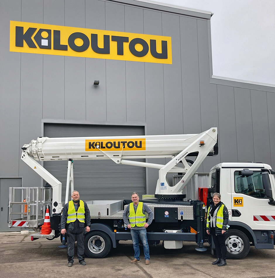 Mit dem Steiger T 300 XS hat Ruthmann seine neueste Lkw-Arbeitsbühne auf die Räder gestellt. Das erste ausgelieferte Modell der Baureihe rollte jetzt zur Zulassungspremiere in die Kiloutou-Niederlassung Erfurt. Mit der schnellen Aufnahme der Neuheit in den Fuhrpark will Kiloutou seinen Anspruch unterstreichen, ständig eine der innovativsten Mietflotten bereitzuhalten. Kiloutou Deutschland, Tochter des drittgrößten europäischen Gerätevermieters, investiert laufend in den Ausbau ihres hochleistungsfähigen Fahrzeugangebots. So kamen erst kürzlich acht Meusburger-Sattelauflieger mit abklappbarem Heck hinzu, denen im Frühjahr acht weitere Auflieger sowie sechs Plateaufahrzeuge plus passender neuer DAF-Sattelzugmaschinen folgen sollen. Mit dem jetzt übernommenen Steiger T 300 XS sortiert sich eine moderne Arbeitsbühnenlösung in den Flottenbestand ein. Die Neuheit will mit 30 m Arbeitshöhe und bis zu 23 m Reichweite bei nur 7,59 m Fahrzeuglänge überzeugen. Dank eines Radstands von nur 3,6 m gilt die Neuheit auch als außerordentlich wendig, die Arbeitskorblast beträgt 350 kg. t