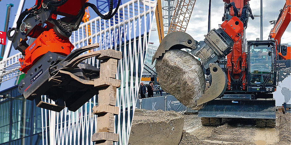 Wie schon auf der Bauma im vergangenen Oktober in München zeigt Kinshofer seinen NOX-Tiltrotator mit einer Vielzahl an unterschiedlichen Anbaugeräten, die in Kombination mit einem Schwenkrotator eingesetzt werden können.