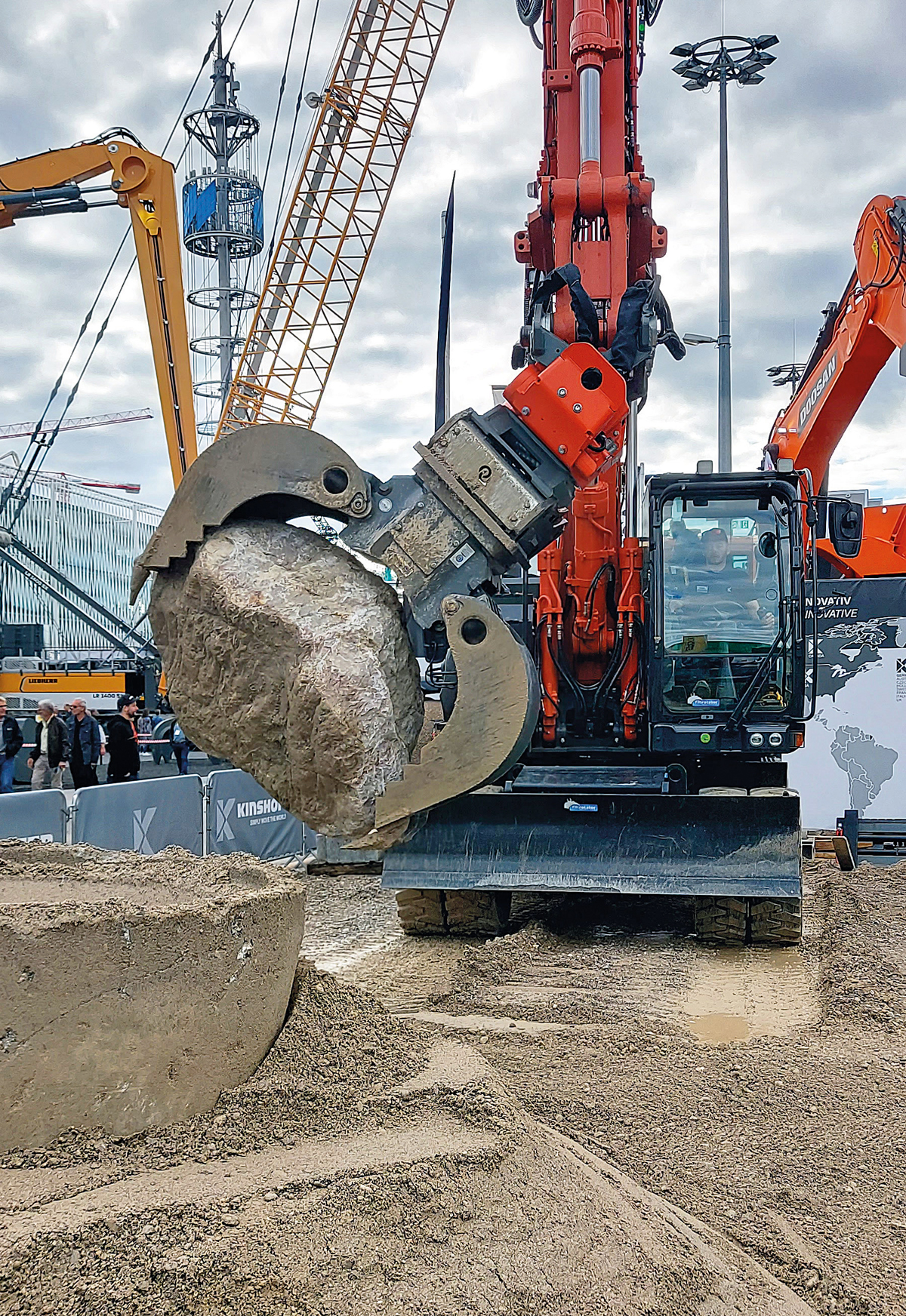 Nicht nur am Stand von Kinshofer und Terrasystems ist der NOX-Tiltrotator vertreten, auch in der Anbaugeräte-Arena der Messe mit der derzeit größten Version des Schwenkrotators bis 25 t im Einsatz mit einem Profillöffel. Zu finden ist der Stand im Freigelände Stand F432.t