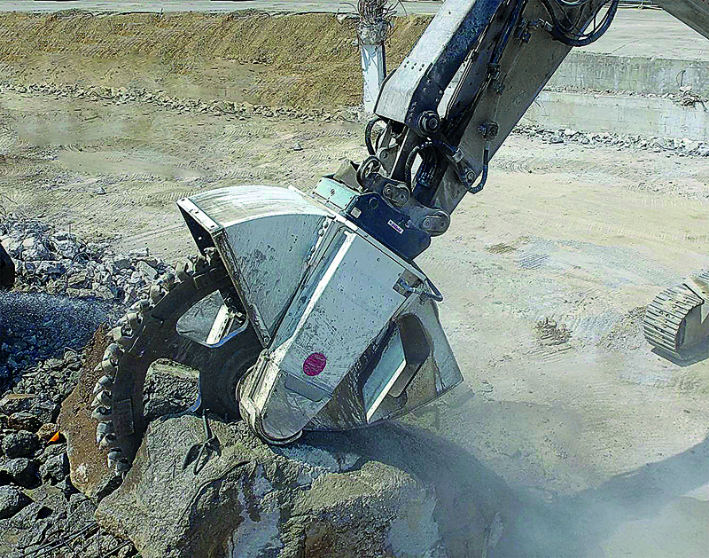 Aktuell bietet Kinshofer für schmale Frässchnitte, bei denen es mehr um Frästiefe als -breite geht, auch das mit Fräsmeißeln bestückte Schneidrad DMW an. Dessen zwei seitlichen Hydraulikmotoren sorgen für höchste Schneidkraft bei ruhigem, gleichmäßigen Arbeiten. Dadurch sollen selbst im harten Gestein sowie im bewehrten Stahlbeton höchst effizient enorme Produktionsleistungen erreicht werden können.