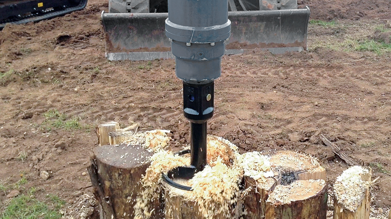 Der Baumstumpffräsbohrer SP250 ist auf eine effektive, saubere Stumpfentfernung ausgelegt. Sowohl der Fräsbohrer als auch der Baumstumpfspalter (Log Splitter) werden mit einem Erdbohrerantrieb betrieben. Dank konischem Außengewinde bohrt sich die Kegelspitze des Log Splitters selbsttätig nach unten, dringt leicht ein und teilt den Stamm.