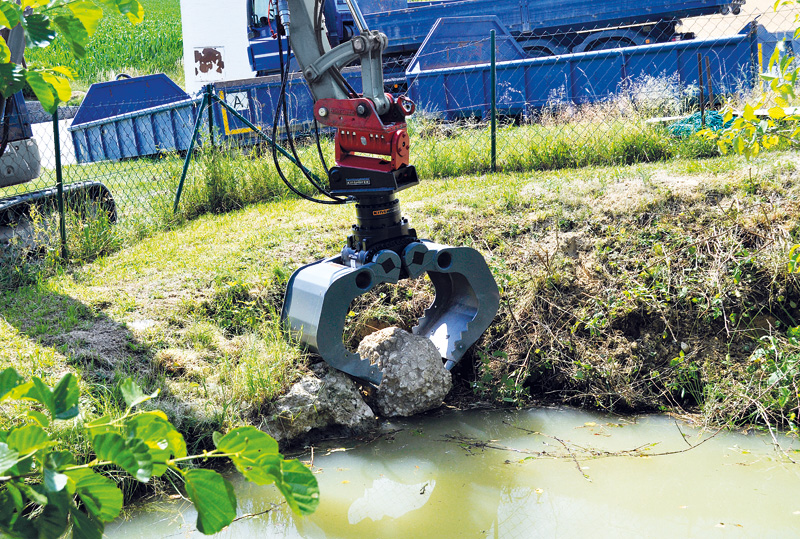 Die A-Greifer punkten zum einen durch ein geringes Eigengewicht – so wiegt der A04H mit Drehmotor nur 190 kg – und zum anderen durch eine niedrige Bauhöhe, in geschlossenem Zustand beim A04H gerade mal 744 mm. Er verdankt seine höhere Losbrechkraft einem sehr flachen 10-t-Drehmotor, dessen 360°-Rotation das Manövrieren und genaue Positionieren von Rand- oder Natursteinen erleichtert. Die Präzision wird auch durch den Festanbau an die Löffelaufnahme des Trägergeräts erzielt. Für den Fall, dass die Steine nicht durch Baggerzähne zerkratzt werden sollen, lassen sich optionale Anpressschienen mit Gummieinsätzen mitbestellen, die mit wenigen Handgriffen schnell ansteckbar sind.