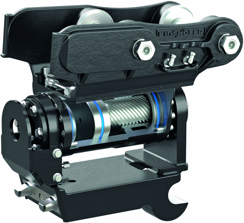 Unterhalb des vorgestellten Schwenkantriebs ist auch der hydraulische Kinshofer-Schnellwechsler in der verstärkten Variante KHS03HD (Lehnhoff-kompatibel) für Bagger zwischen 4,8 t und 6,5 t Dienstgewicht erhältlich. Die rein mechanische Verriegelung mittels Feder (einfach wirkender Zylinder) wurde nun um eine hydraulische Verriegelung (doppelt wirkender Zylinder) für eine weiter erhöhte Sicherheit ergänzt. §